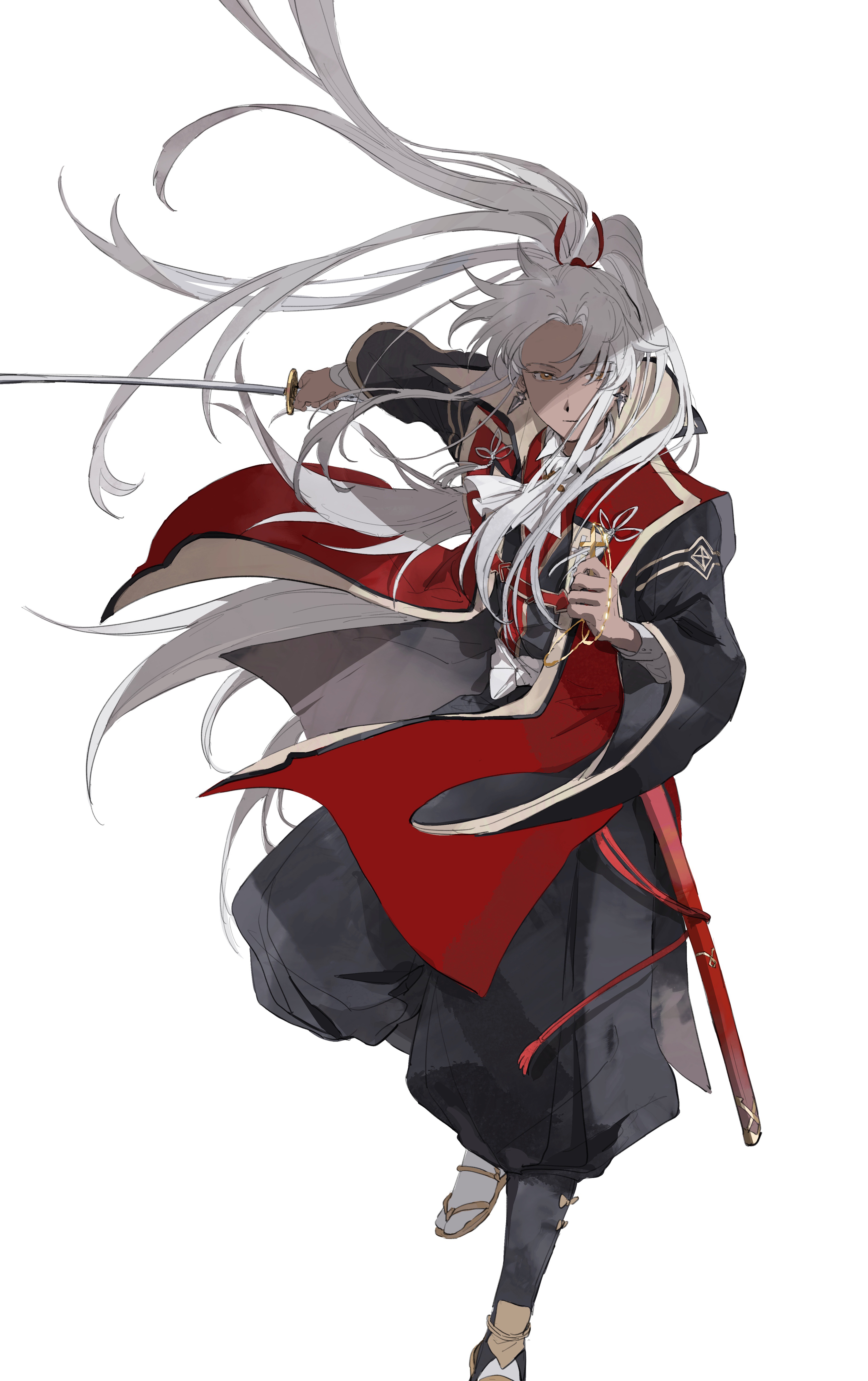 1boy absurdres amakusa_shirou_(fate) amakusa_shirou_(third_ascension)_(fate) ascot commentary_request cross dark-skinned_male dark_skin earrings fate/grand_order fate_(series) full_body highres holding holding_cross japanese_clothes jewelry jinbaori kataginu katana long_hair looking_at_viewer male_focus miike_tenta_mitsuyo_(fate) mimulishizi ponytail ribbon simple_background solo sword very_long_hair weapon white_ascot white_background white_hair wide_sleeves yellow_eyes