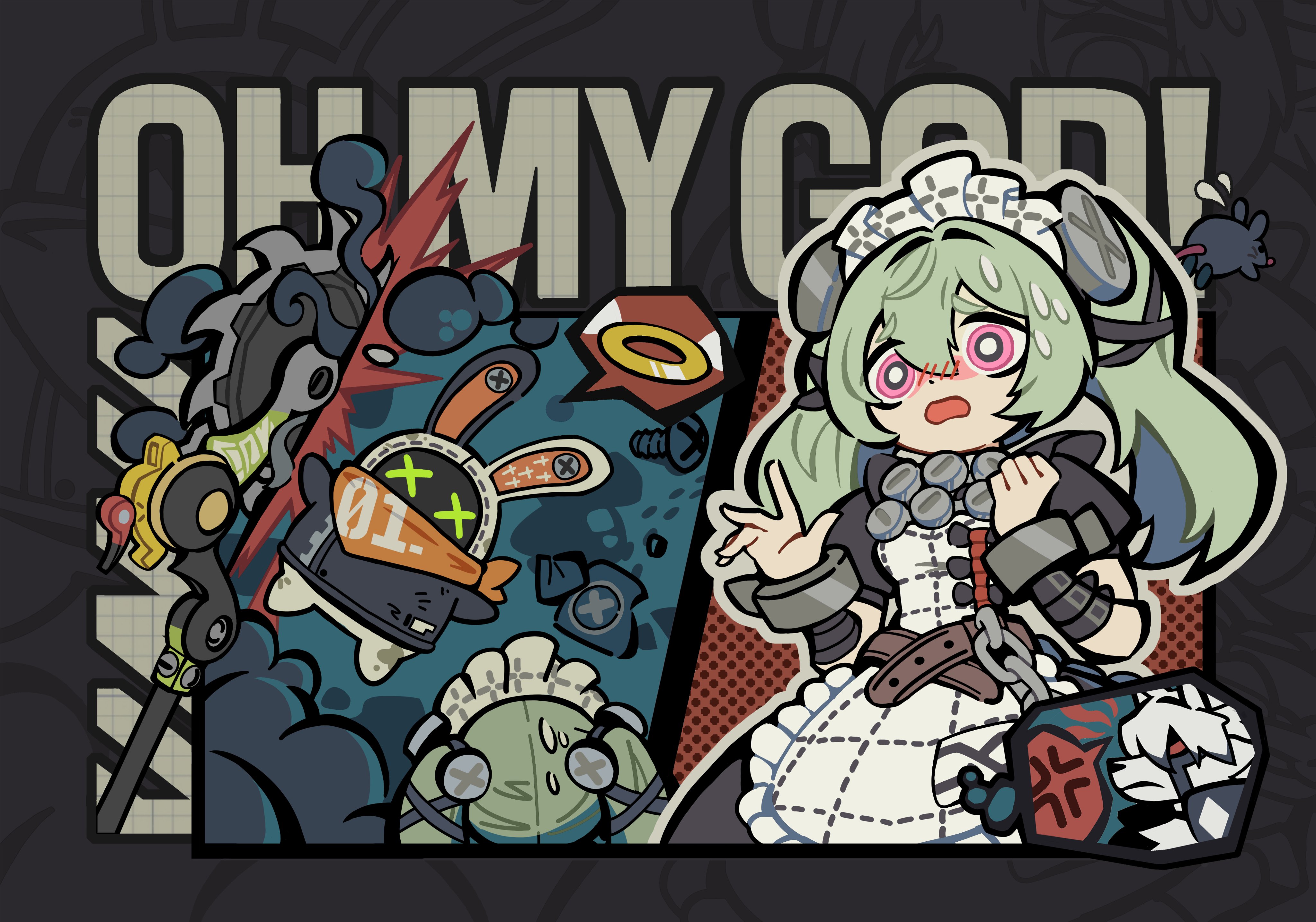 1boy 1girl absurdres anger_vein animal_ears apron belt black_dress brown_belt chain circular_saw commentary corin_wickes cuffs dress english_commentary english_text eous_(zenless_zone_zero) flying_sweatdrops furry furry_male green_hair hair_between_eyes hands_up highres ilc07137 long_hair maid maid_apron maid_headdress mouse_(animal) open_mouth puffy_short_sleeves puffy_sleeves purple_eyes red_eyes saw screw screw_hair_ornament short_sleeves spoken_anger_vein sweat twintails von_lycaon weapon white_hair wolf_boy wolf_ears x_x zenless_zone_zero