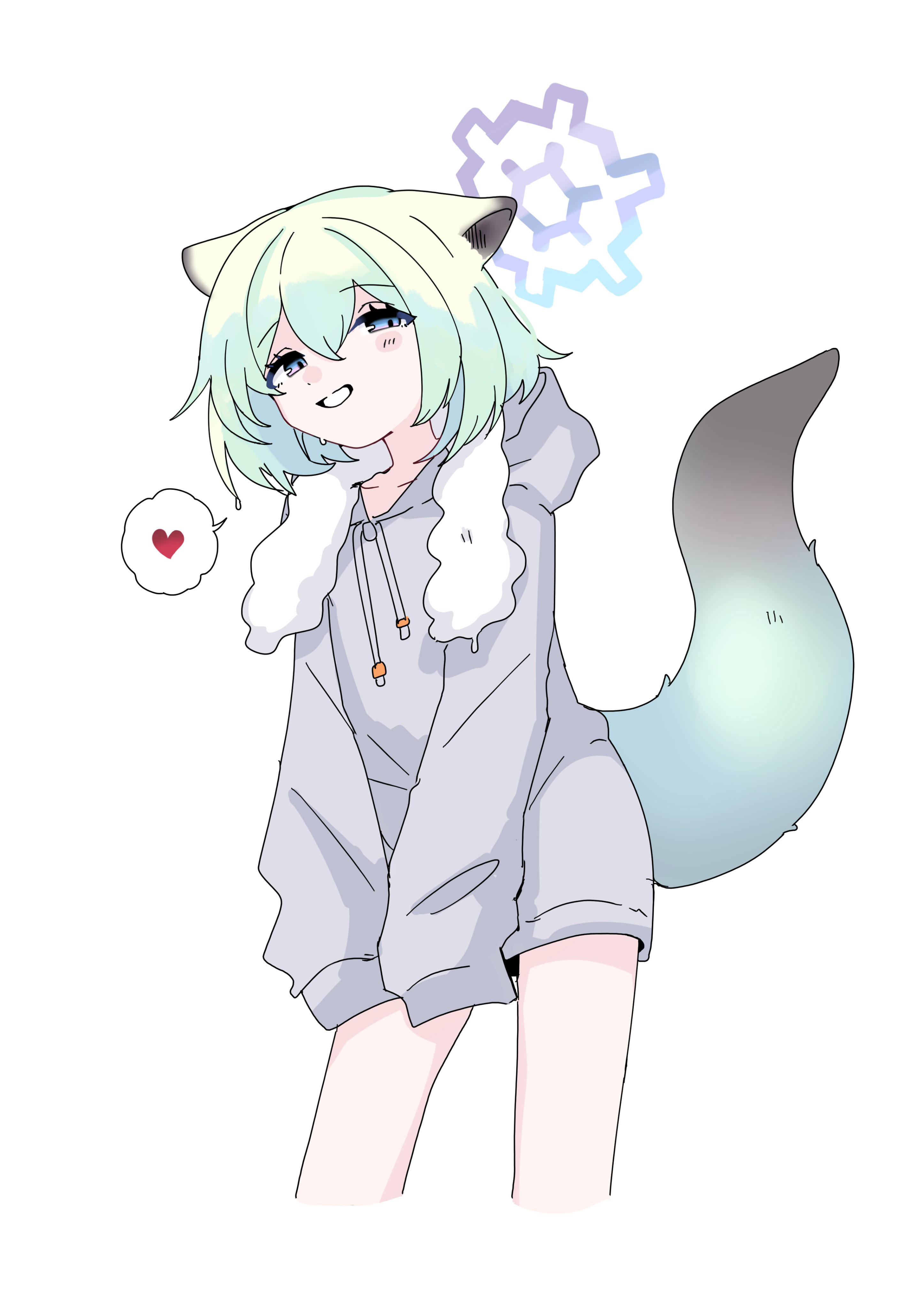 1girl absurdres animal_ears blue_archive blue_eyes blush bobok cropped_legs green_hair grey_hoodie grin hair_between_eyes halo heart highres hood hood_down hoodie long_sleeves looking_at_viewer purple_halo shigure_(blue_archive) short_hair simple_background sleeves_past_fingers sleeves_past_wrists smile solo spoken_heart tail towel towel_around_neck weasel_ears weasel_tail white_background