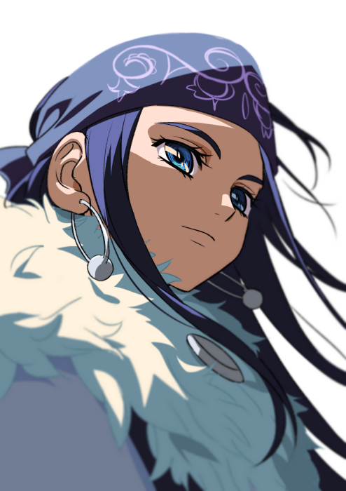 1girl ainu ainu_clothes asirpa bandana blue_eyes blue_hair closed_mouth earrings golden_kamuy headband hoop_earrings jewelry long_hair looking_ahead simple_background smile solo upper_body white_background yoko.u