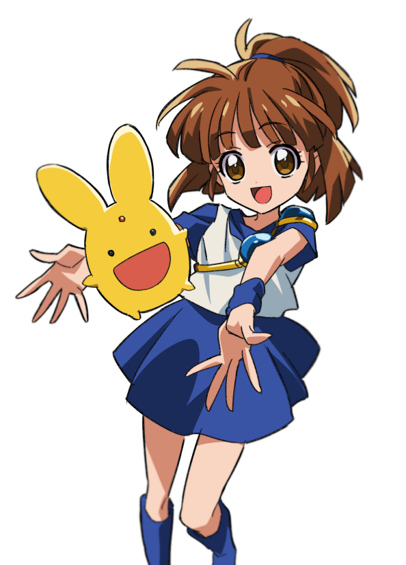 1girl :d arle_nadja blue_boots blue_skirt boots brown_eyes brown_hair carbuncle_(puyopuyo) feet_out_of_frame half_updo looking_at_viewer madou_monogatari open_mouth outstretched_arms ponytail puyopuyo short_hair simple_background skirt smile solo standing white_background yoko.u