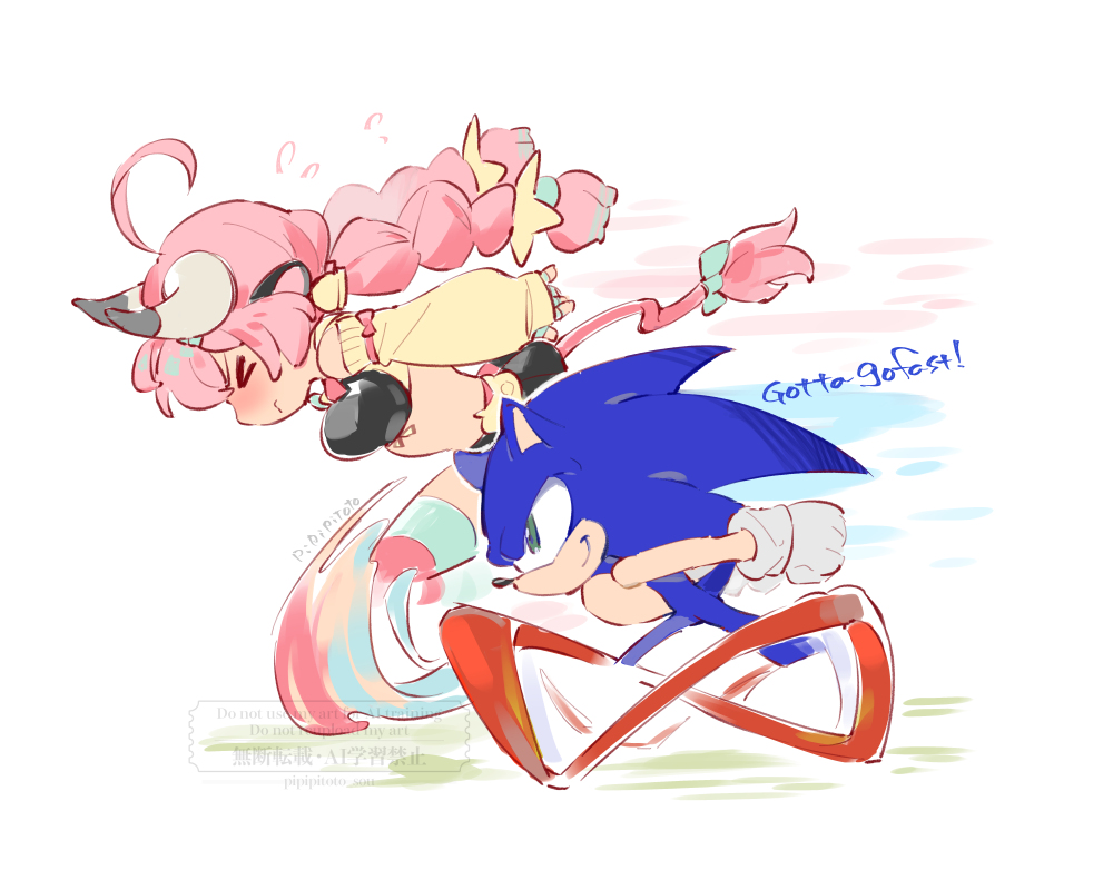 >_< 1boy 1girl ahoge animal_ears bare_shoulders black_shorts blue_fur braid breasts cow_ears cow_girl cow_horns cow_tail crop_top crossover english_text furry furry_male genshin_impact gloves green_eyes hedgehog_boy horns jacket long_hair long_sleeves open_clothes open_jacket pink_hair pipipitoto_sou running shirt shorts simple_background smile sonic_(series) sonic_the_hedgehog tail twin_braids varesa_(genshin_impact) wheel_o_feet white_gloves yellow_jacket