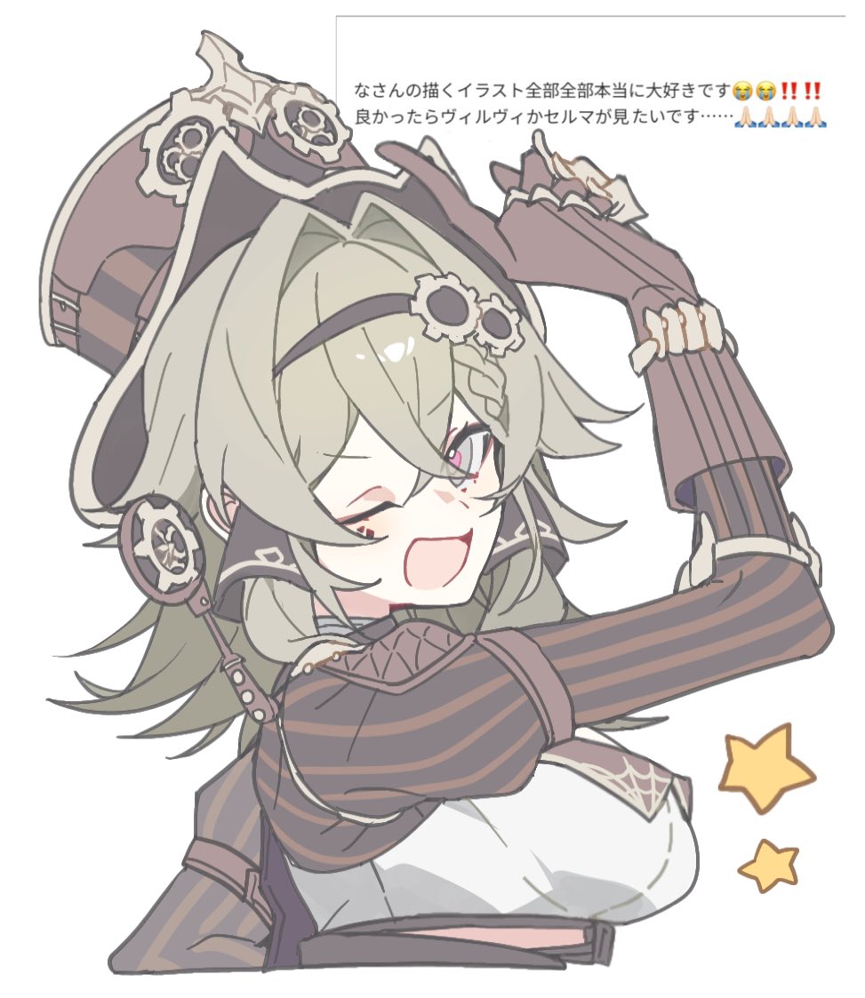 1girl black_hairband brown_gloves brown_hat brown_sleeves commentary_request cropped_torso crossed_bangs from_side gear_hair_ornament gloves grey_eyes hair_between_eyes hair_intakes hairband hat honkai_(series) honkai_impact_3rd long_sleeves nonaa4141 one_eye_closed open_mouth pink_pupils request_inset simple_background smile solo star_(symbol) top_hat translation_request vill-v white_background