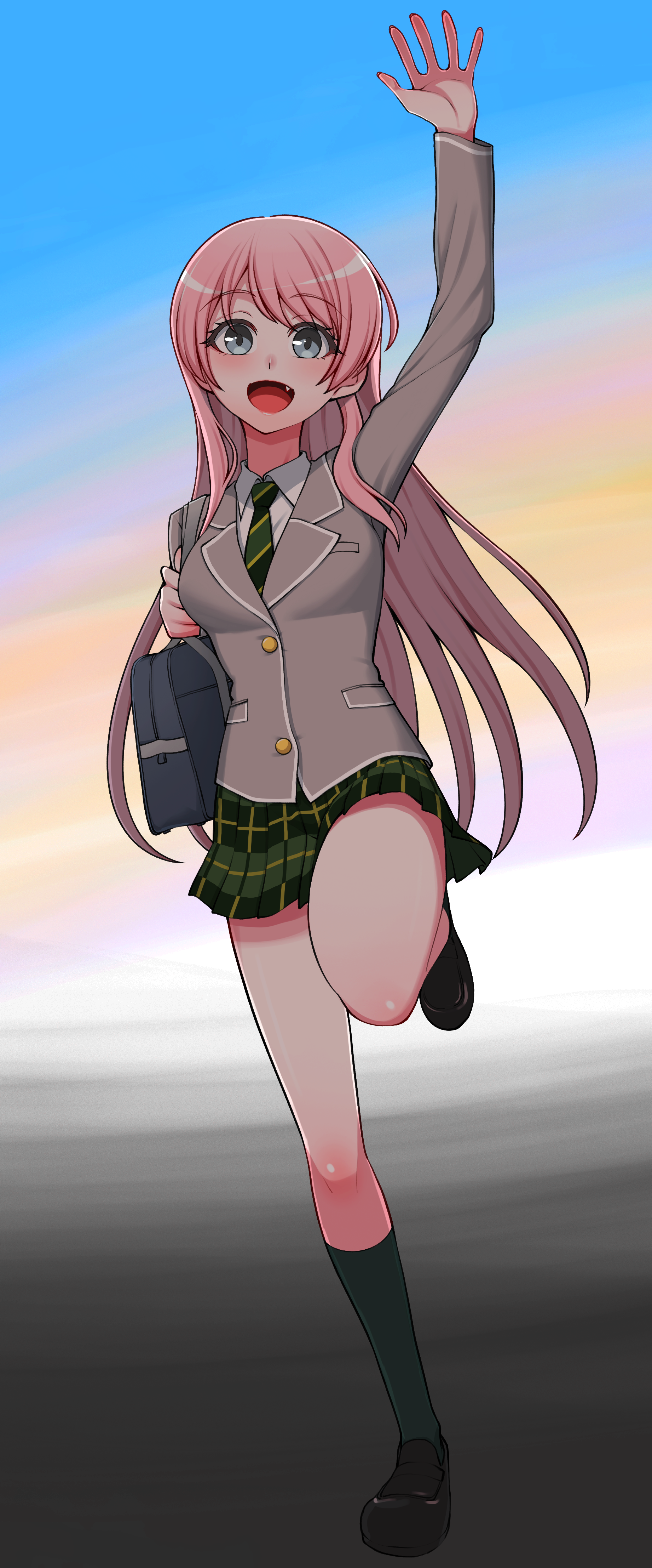 1girl :d absurdres arm_up bag bang_dream! bang_dream!_it's_mygo!!!!! black_shoes black_socks blue_background blue_eyes breast_pocket breasts buttons chihaya_anon collared_shirt colorful_background commentary_request diagonal-striped_clothes diagonal-striped_necktie fang full_body gradient_background green_necktie green_skirt grey_background grey_jacket hand_up haneoka_school_uniform highres holding_strap jacket kneehighs leg_up loafers long_hair long_sleeves looking_at_viewer medium_breasts miniskirt necktie open_mouth orange_background pink_hair plaid_clothes plaid_skirt pleated_skirt pocket purple_background sasaki33916 school_bag school_uniform shirt shoes shoulder_bag sidelocks skirt smile socks solo standing standing_on_one_leg striped_clothes white_shirt