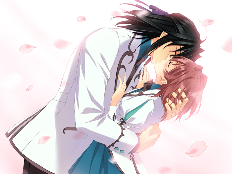 1boy 1girl amawashi_miku black_hair blush brown_hair couple closed_eyes game_cg garnet_cradle hair_ribbon half_updo hetero hug kiss kumoya_yukio official_art petals ribbon school_uniform screencap shirato_sou short_hair