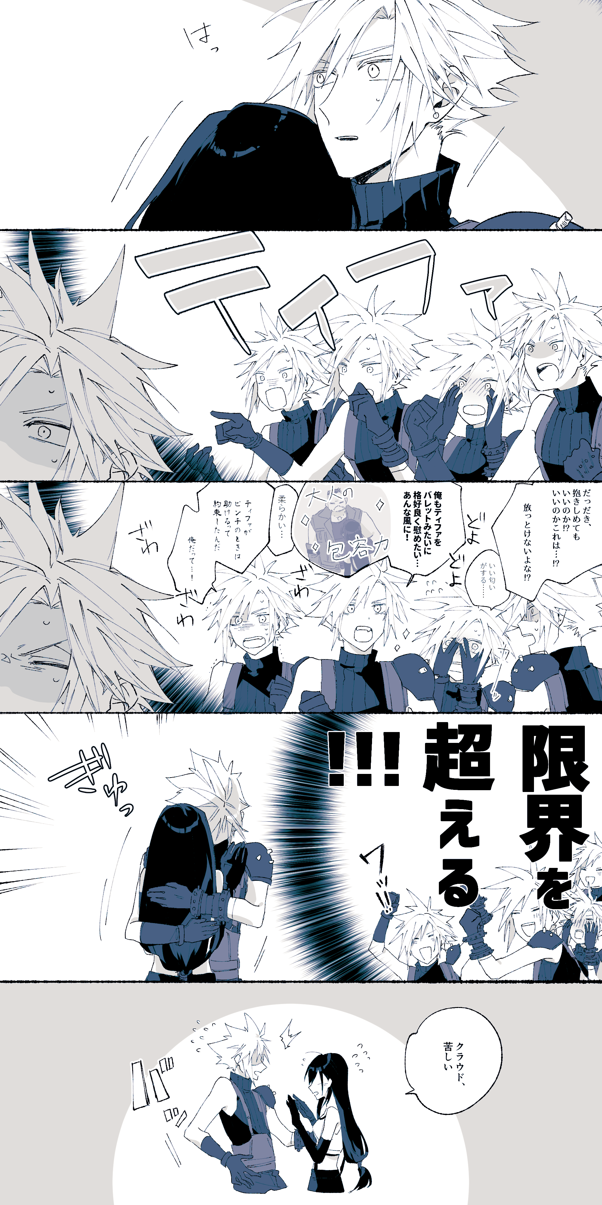1girl 5boys absurdres armor bare_shoulders barret_wallace blush cloud_strife commentary_request crop_top earrings emphasis_lines final_fantasy final_fantasy_vii final_fantasy_vii_remake flying_sweatdrops gloves highres hug jewelry limited_palette long_hair low-tied_long_hair momiji409 motion_lines multiple_boys multiple_persona nervous_sweating open_mouth shaded_face short_hair shoulder_armor single_bare_shoulder sleeveless sleeveless_turtleneck sparkle speech_bubble spiked_hair stud_earrings suspenders sweat sweatdrop sweater tank_top tifa_lockhart translation_request trembling turtleneck turtleneck_sweater upper_body white_tank_top