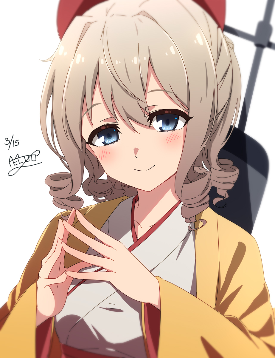 1girl anime_coloring blue_eyes brown_hair coat drill_hair furisode hair_between_eyes hair_ribbon haori hatakaze_(kancolle) highres japanese_clothes kantai_collection kimono looking_at_viewer medium_hair meiji_schoolgirl_uniform necono_(nekonosora1207) one-hour_drawing_challenge ponytail ribbon rigging simple_background solo steepled_fingers upper_body white_background white_kimono yellow_coat