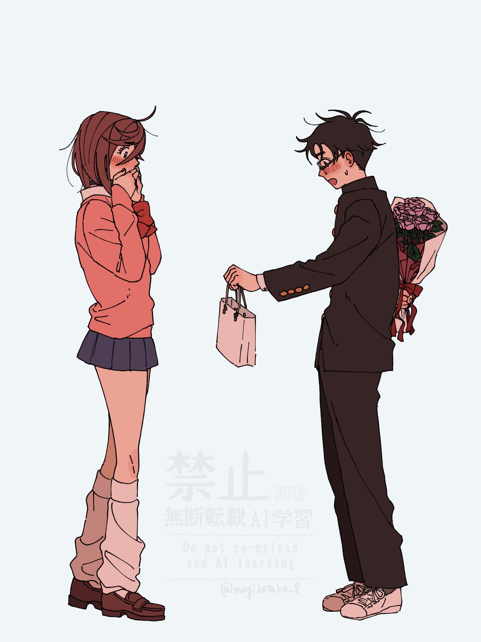 1boy 1girl arm_behind_back ayase_momo bag black_hair black_jacket black_pants blue_skirt blush bouquet bow bowtie brown_hair brown_shoes collared_shirt commentary_request couple covering_own_mouth dandadan flower from_side full_body gakuran gift glasses highres holding holding_bag holding_bouquet holding_gift jacket long_sleeves looking_at_another loose_socks medium_hair messy_hair miniskirt mugibatake open_mouth pants pink_flower pink_sweater pleated_skirt profile red_bow red_bowtie school_uniform shirt shoes short_hair skirt socks standing sweatdrop sweater takakura_ken_(dandadan) thighs watermark white_day white_shirt white_shoes white_socks
