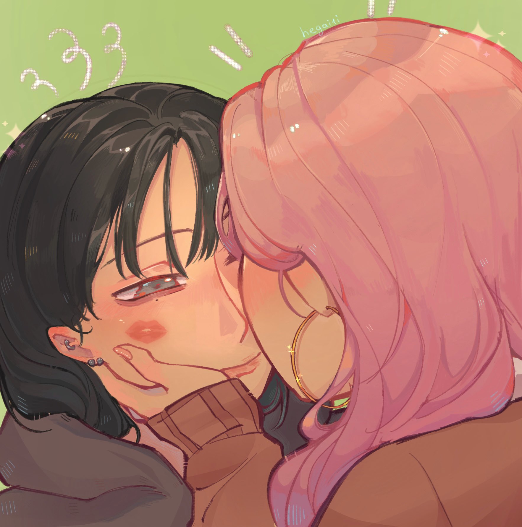 2girls artist_name black_hair brown_sweater commentary earrings english_commentary green_background grey_eyes hand_on_another's_cheek hand_on_another's_face hegaiii highres hood hoodie hoop_earrings jewelry kininatteru_hito_ga_otoko_ja_nakatta koga_mitsuki lipstick_mark lipstick_mark_on_face lipstick_mark_on_face multiple_girls oosawa_aya pink_hair portrait smile sweater yuri