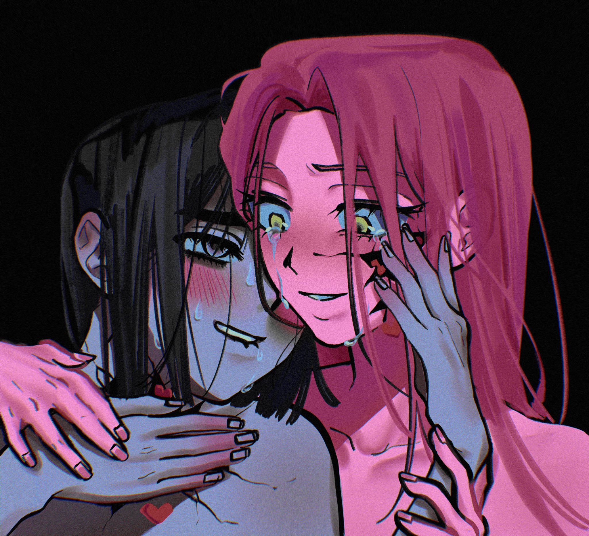 2girls aendee alien_stage bad_id bad_twitter_id biting_own_lip black_background blush cracked_skin hand_on_another's_face hand_on_another's_wrist heart highres inactive_account looking_at_another mizi_(alien_stage) multiple_girls pink_hair simple_background smile sua_(alien_stage) yellow_eyes