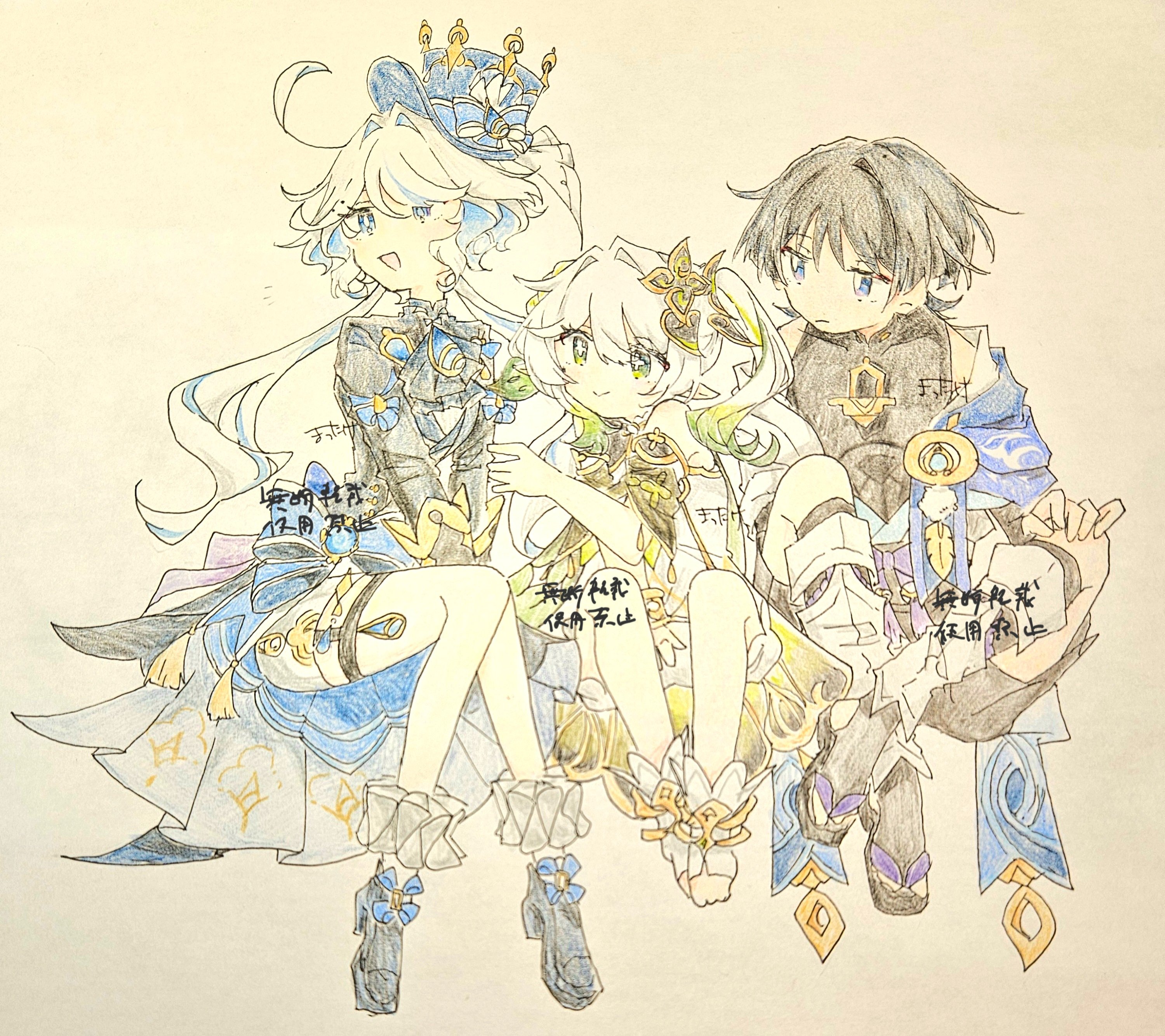 1boy 2girls :> absurdres ahoge anklet armlet ascot black_ascot black_bodysuit black_hair black_jacket black_leggings black_sandals black_shoes black_shorts black_sleeves bloomers blue_bow blue_cape blue_eyes blue_gem blue_hair blue_hat blue_pupils bodysuit bow bright_pupils brooch cape closed_mouth coattails colored_inner_hair covered_collarbone cowlick cross-shaped_pupils curly_ends detached_sleeves dress eyelash_ornament eyelashes feathers footwear_bow frilled_socks frills fringe_trim furina_(genshin_impact) garter_belt gem genshin_impact gold gold_trim green_cape green_eyes green_hair grey_shorts hair_intakes hair_ornament hand_between_thighs hand_on_own_knee hand_up hat hat_bow highres hydro_symbol_(genshin_impact) jacket japanese_clothes jewelry kimono knees_together_feet_apart knees_up leaf leaf_hair_ornament leg_warmers leggings long_hair long_sleeves looking_to_the_side mandarin_collar mini_hat mini_top_hat mismatched_pupils multicolored_hair multiple_girls nahida_(genshin_impact) notice_lines onu5mochini pointy_ears pom_pom_(clothes) purple_bow purple_rope rope sandals scaramouche_(genshin_impact) shoes short_sleeves shorts shoulder_peek side_ponytail sidelocks single_off_shoulder sitting sketch smile socks stirrup_legwear symbol-shaped_pupils tailcoat thigh_strap toeless_legwear toeless_socks toes top_hat traditional_media translation_request underwear vision_(genshin_impact) wanderer_(genshin_impact) white_bloomers white_dress white_hair white_kimono white_leg_warmers white_pupils white_sleeves white_socks white_trim yellow_feathers zouri