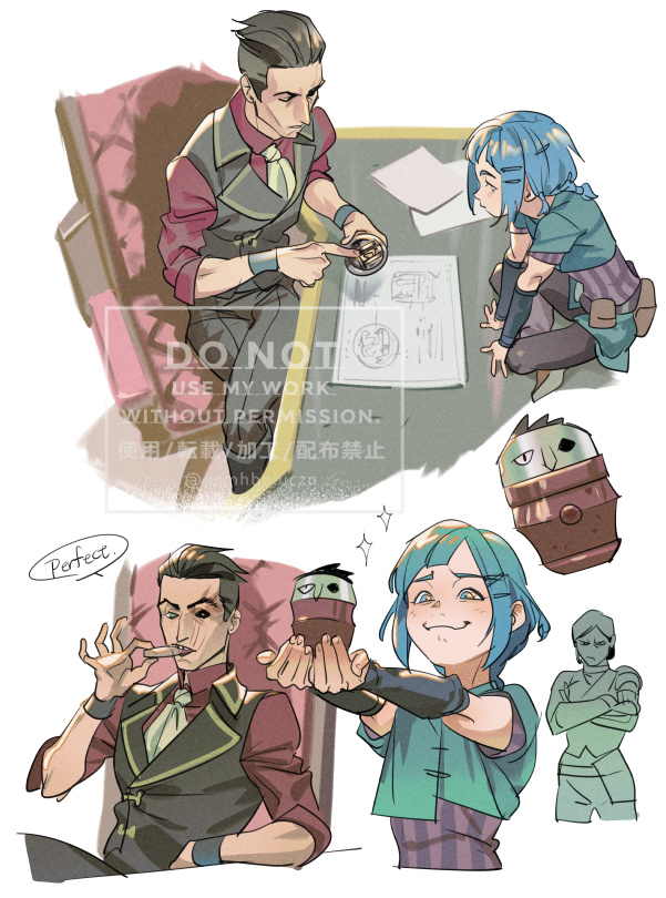 1boy 2girls arcane:_league_of_legends black_sclera blush brown_hair child colored_sclera crossed_arms explosive green_hair grenade hair_ornament hairclip holding holding_grenade jinx_(league_of_legends) league_of_legends multiple_girls powder_(arcane) red_eyes sevika_(arcane) shirt short_hair short_sleeves silco_(arcane) smile sparkle striped_clothes striped_shirt tatsumi_(psmhbpiuczn) watermark white_background