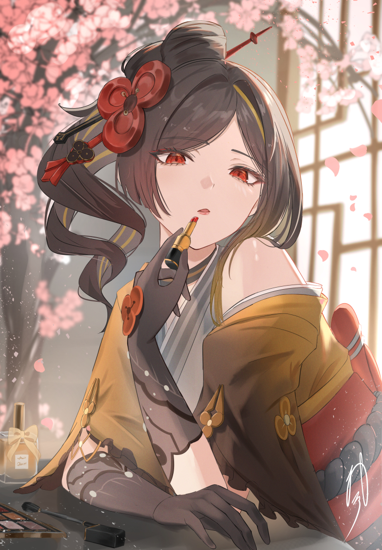1girl applying_lipstick applying_makeup applying_own_makeup arm_rest bare_shoulders black_gloves blonde_hair bottle brown_hair cherry_blossoms chiori_(genshin_impact) commentary cosmetics english_commentary falling_petals genshin_impact gloves grey_kimono hair_ornament hair_stick hand_up holding holding_lipstick_tube japanese_clothes kimono lipstick_tube long_hair looking_at_viewer makeup_brush makeup_palette multicolored_hair nail_polish_bottle oiro_ik parted_lips perfume_bottle petals red_eyes signature solo streaked_hair upper_body window