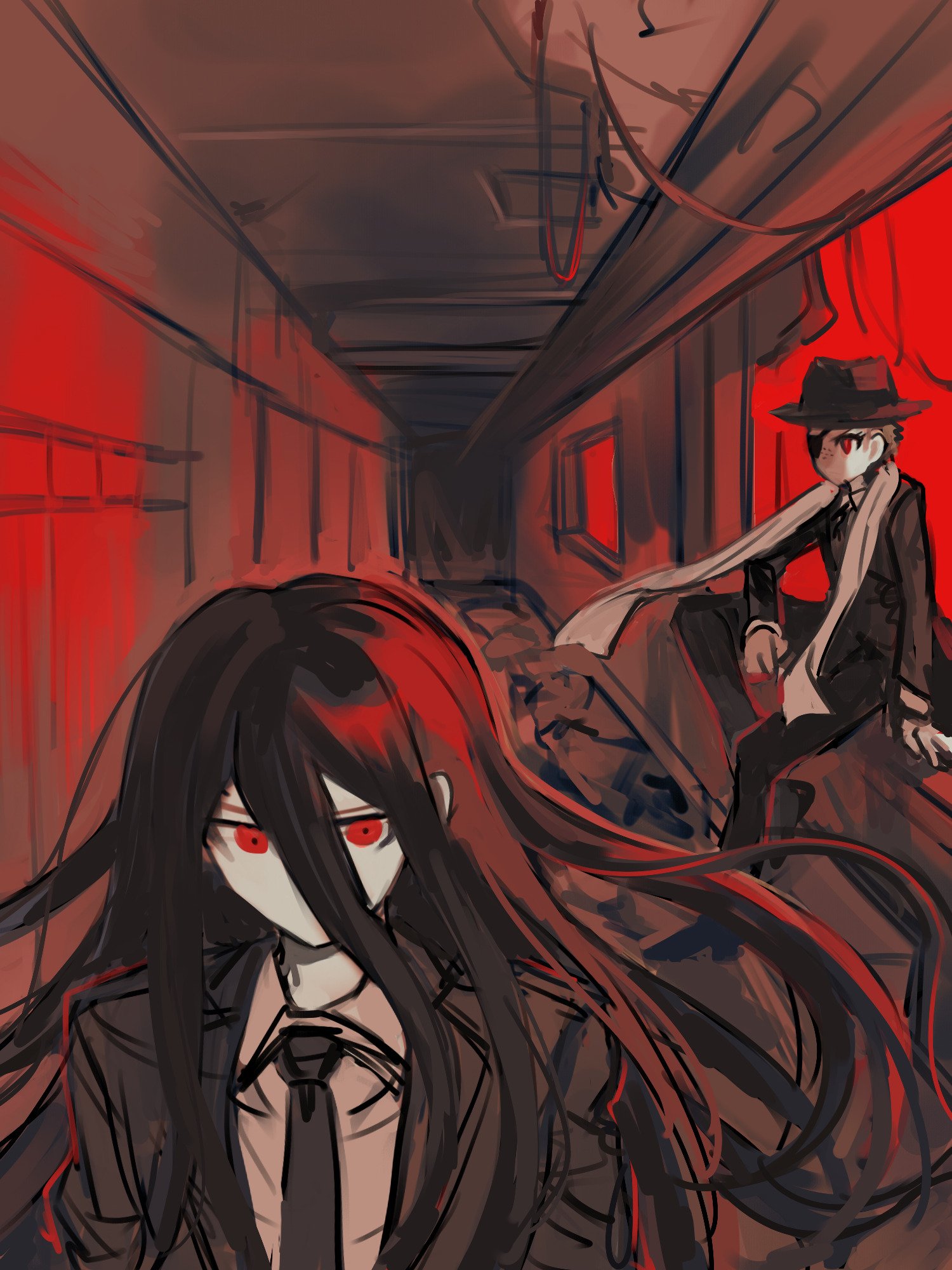 2boys black_hat black_jacket black_necktie black_pants brown_hair casssstle12 collared_shirt danganronpa_(series) danganronpa_2:_goodbye_despair eyepatch formal_clothes grey_shirt hat highres indoors jacket kamukura_izuru kuzuryu_fuyuhiko long_hair long_sleeves multiple_boys necktie official_alternate_costume pants red_eyes shirt window