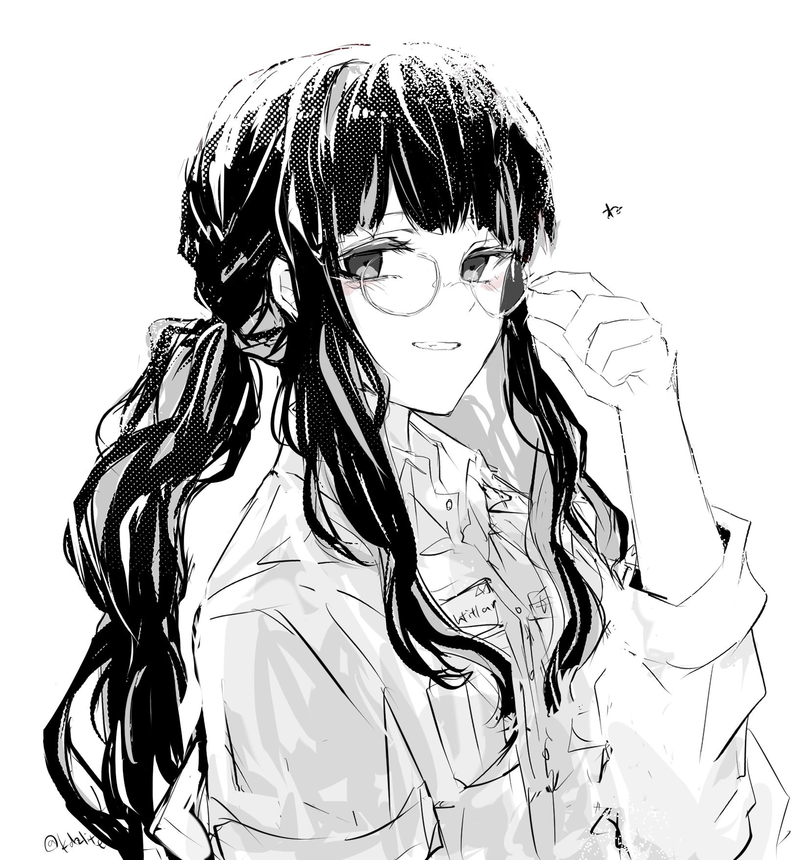 1girl adjusting_eyewear black_hair blue_hair blue_shirt colored_inner_hair fate/grand_order fate_(series) glasses grey_eyes hand_on_eyewear highres looking_at_viewer multicolored_hair round_eyewear shirt skirt smile sodamachi tenochtitlan_(fate) tenochtitlan_(fgo_mart)_(fate) twintails two-tone_hair white_background