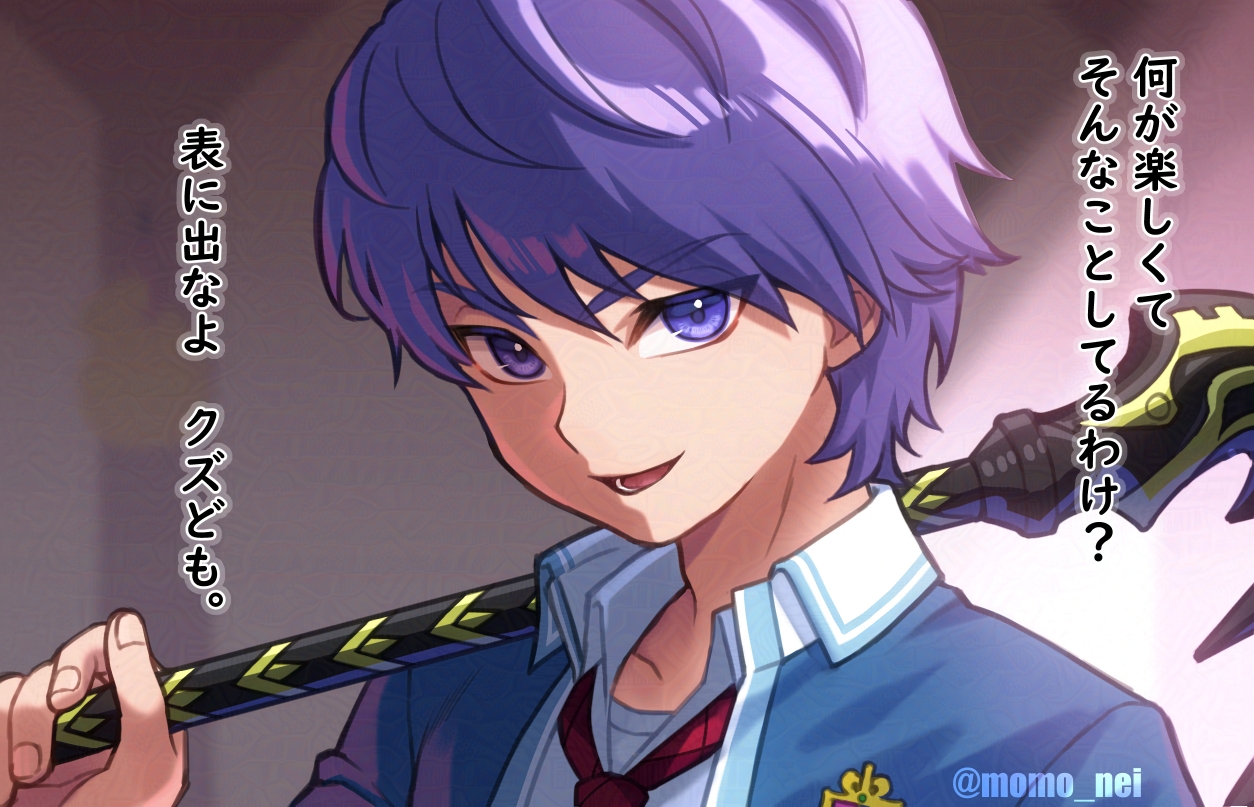 1boy adversarial_noise blazer blue_eyes blue_hair blurry blurry_background commentary_request dragon_quest dragon_quest_x holding holding_staff indoors jacket looking_at_viewer male_focus momo_nei necktie open_mouth plaid_clothes plaid_necktie red_necktie risoru_(dq10) school_uniform short_hair smile solo staff translation_request twitter_username upper_body