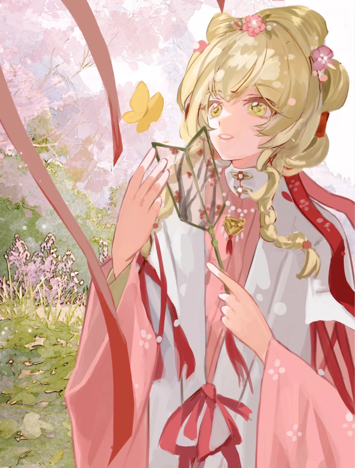 1girl bead_necklace beads berubetto blonde_hair bow-shaped_hair braid bug bush butterfly chinese_clothes chinese_commentary commentary_request cowboy_shot day floral_print flower grass green_eyes hair_beads hair_flower hair_ornament hand_fan hanfu happy highres holding holding_fan insect jewelry lips long_sleeves looking_ahead necklace official_alternate_costume open_mouth outdoors pink_flower pink_hanfu red_ribbon reverse:1999 ribbon short_hair_with_long_locks sky smile solo sotheby sotheby_(the_red_thread_of_fate) spring_(season) standing teeth tree tuanshan twin_braids updo waist_ribbon white_hanfu white_sky wide_sleeves yellow_butterfly