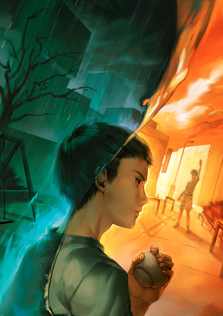2boys arm_up ball bare_arms baseball black_eyes black_hair black_shoes blue_shirt bush cargo_shorts character_request city cloud cloudy_sky commentary cover cover_page english_commentary expressionless fingernails from_behind full_body highres holding holding_ball lamppost male_focus multiple_boys official_art orange_sky outdoors parted_lips patipat_asavasena rain shirt shoes short_hair shorts sidewalk sky split_theme swing t-shirt thick_eyebrows toshi_densetsu_sepia upper_body water wet white_shirt white_shorts