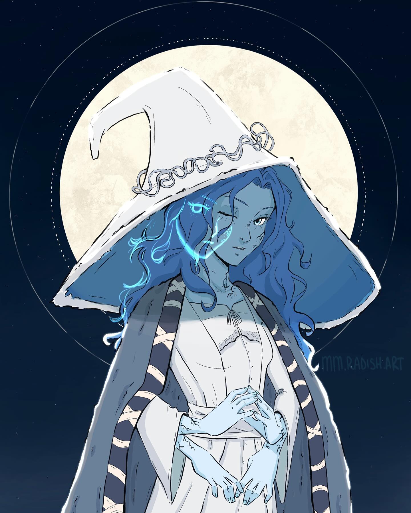 1girl blue_eyes blue_hair blue_skin breasts colored_skin commentary cracked_skin dress elden_ring english_commentary extra_arms full_moon grey_cloak hat highres mickala_(mm.radish.art) moon one_eye_closed procreate_(medium) ranni_the_witch small_breasts solo upper_body wavy_hair white_dress white_hat wide_sleeves witch_hat