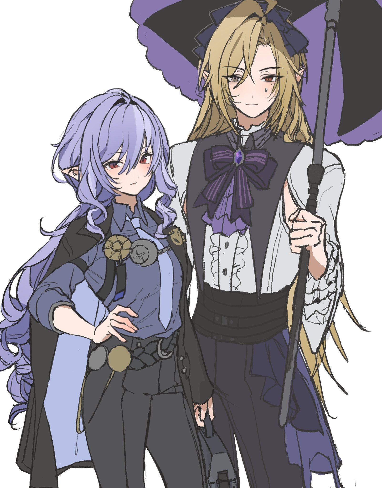 1boy 1girl belt blonde_hair bow bowtie collared_shirt cosplay crossdressing drill_hair frills hair_between_eyes hairband hand_on_own_hip heterochromia highres holding holding_umbrella hssfaxee hugo_vlad hugo_vlad_(cosplay) jacket lolita_hairband long_hair long_sleeves looking_at_viewer mole mole_under_eye necktie pants parasol pointy_ears purple_hair red_eyes shirt simple_background sweat umbrella very_long_hair vivian_banshee vivian_banshee_(cosplay) white_background zenless_zone_zero