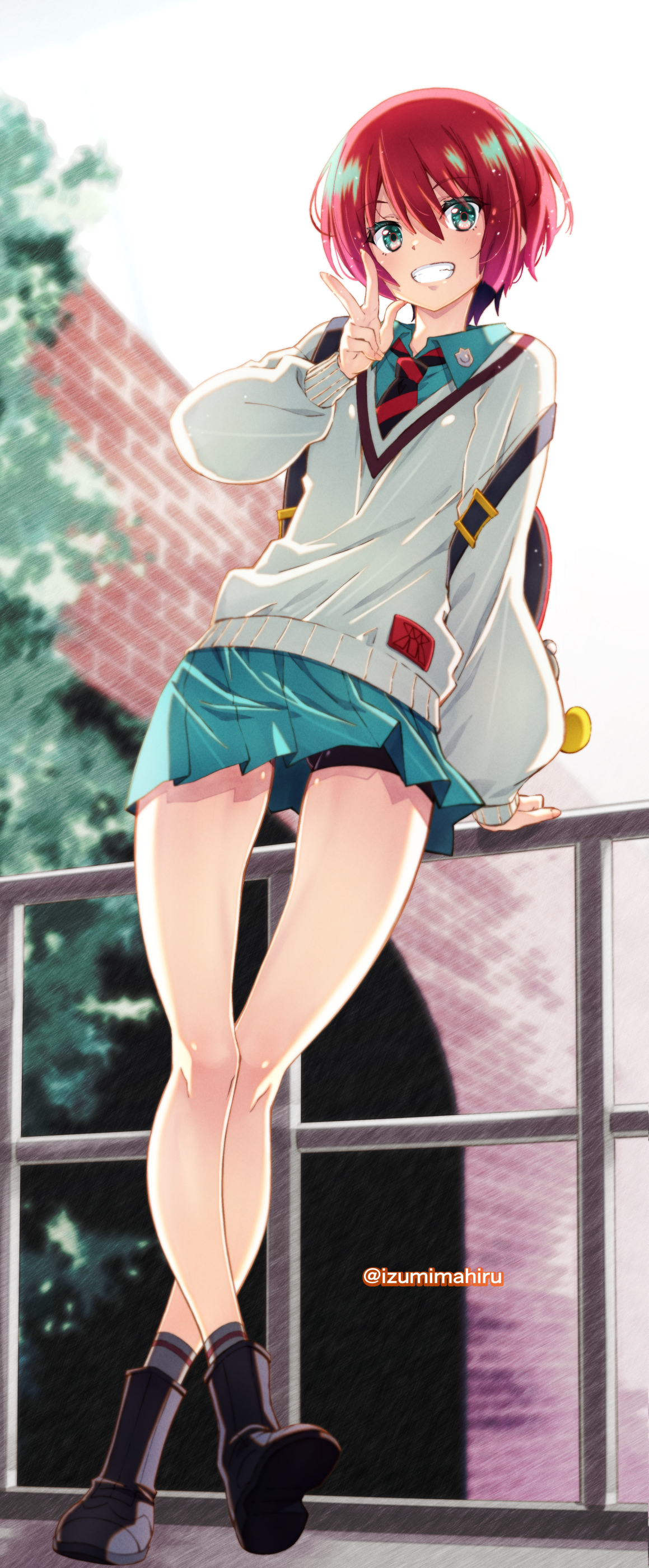 1girl absurdres against_railing amate_yuzuriha aqua_shirt aqua_skirt backpack bag bike_shorts bike_shorts_under_skirt boots brick_wall collared_shirt crossed_legs full_body grin gundam gundam_gquuuuuux highres izumi_mahiru looking_at_viewer necktie pleated_skirt railing red_hair school_uniform shirt short_hair skirt smile socks solo standing striped_clothes striped_necktie sweater tree twitter_username upskirt v white_sweater