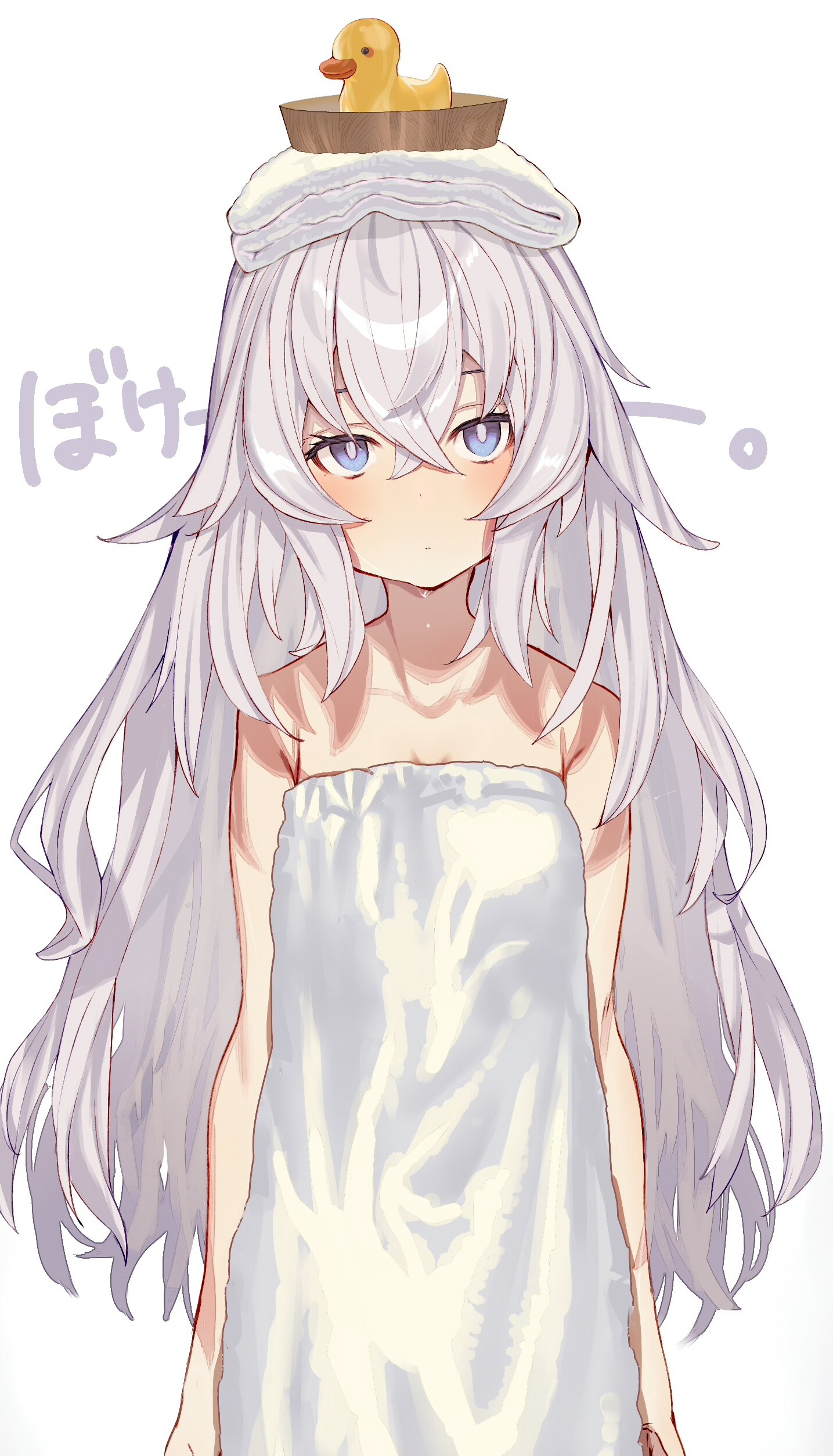 1girl absurdres blue_eyes bright_pupils dripping fate/grand_order fate_(series) grey_hair highres long_hair rubber_duck saika_magoichi_(fate) solo standing towel towel_on_head tsukudani_(ore624) very_long_hair wet white_background white_pupils