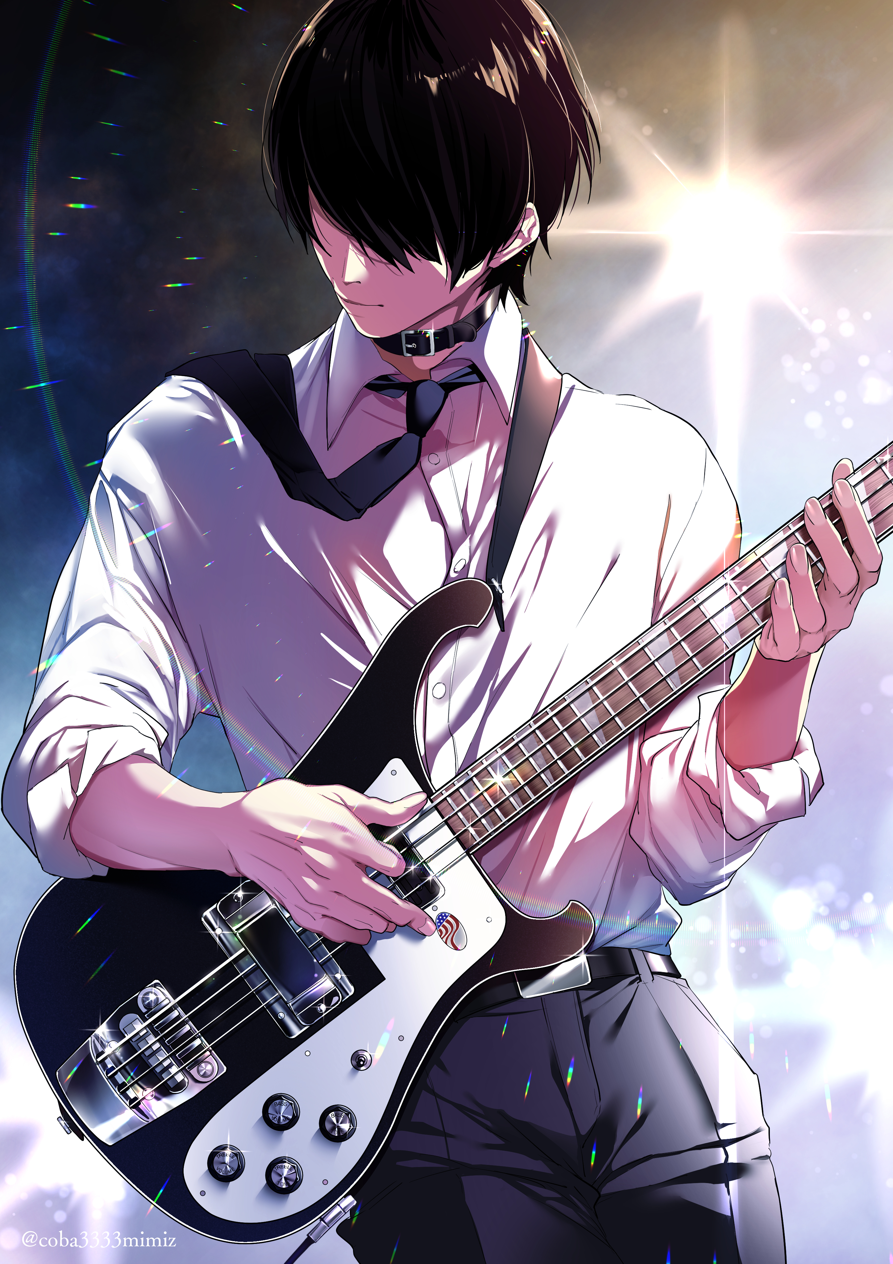 1boy absurdres bass_guitar belt belt_collar black_hair black_necktie black_pants cable closed_mouth cobacomimiz33 collar commentary_request covered_eyes cowboy_shot dress_shirt bass_guitar guitar_strap highres holding holding_bass_guitar holding_instrument hozumi_natsuki_(cobacomimiz33) instrument lens_flare male_focus necktie necktie_over_shoulder original outdoors pants rickenbacker_4003 salaryman shirt shirt_tucked_in short_hair solo twitter_username white_shirt