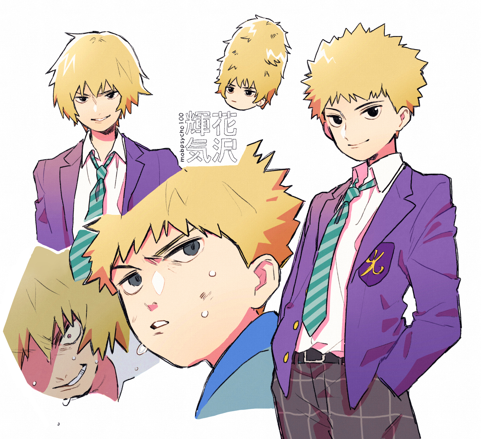1boy beehive_hairdo belt belt_buckle black_belt black_eyes blazer blonde_hair blue_necktie breast_pocket buckle closed_mouth collared_jacket collared_shirt commentary_request copyright_name cowboy_shot crazy_smile crest cropped_torso grey_pants hanazawa_teruki hands_in_pockets head_only highres jacket kouhara_yuyu lapels long_sleeves mob_psycho_100 multiple_views necktie nervous_sweating notched_lapels open_mouth pants parted_lips plaid_clothes plaid_pants pocket pointy_nose purple_jacket school_uniform shirt short_hair simple_background smile smirk spiked_hair standing striped_clothes striped_necktie sweat teeth white_background white_shirt wide-eyed