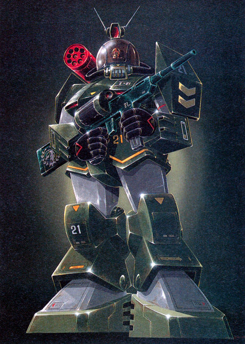 1980s_(style) gun holding holding_gun holding_weapon machinery mecha mecha_focus missile_pod oldschool ookawara_kunio production_art radio_antenna realistic retro_artstyle robot scan science_fiction soltic_h8_roundfacer taiyou_no_kiba_dougram traditional_media weapon