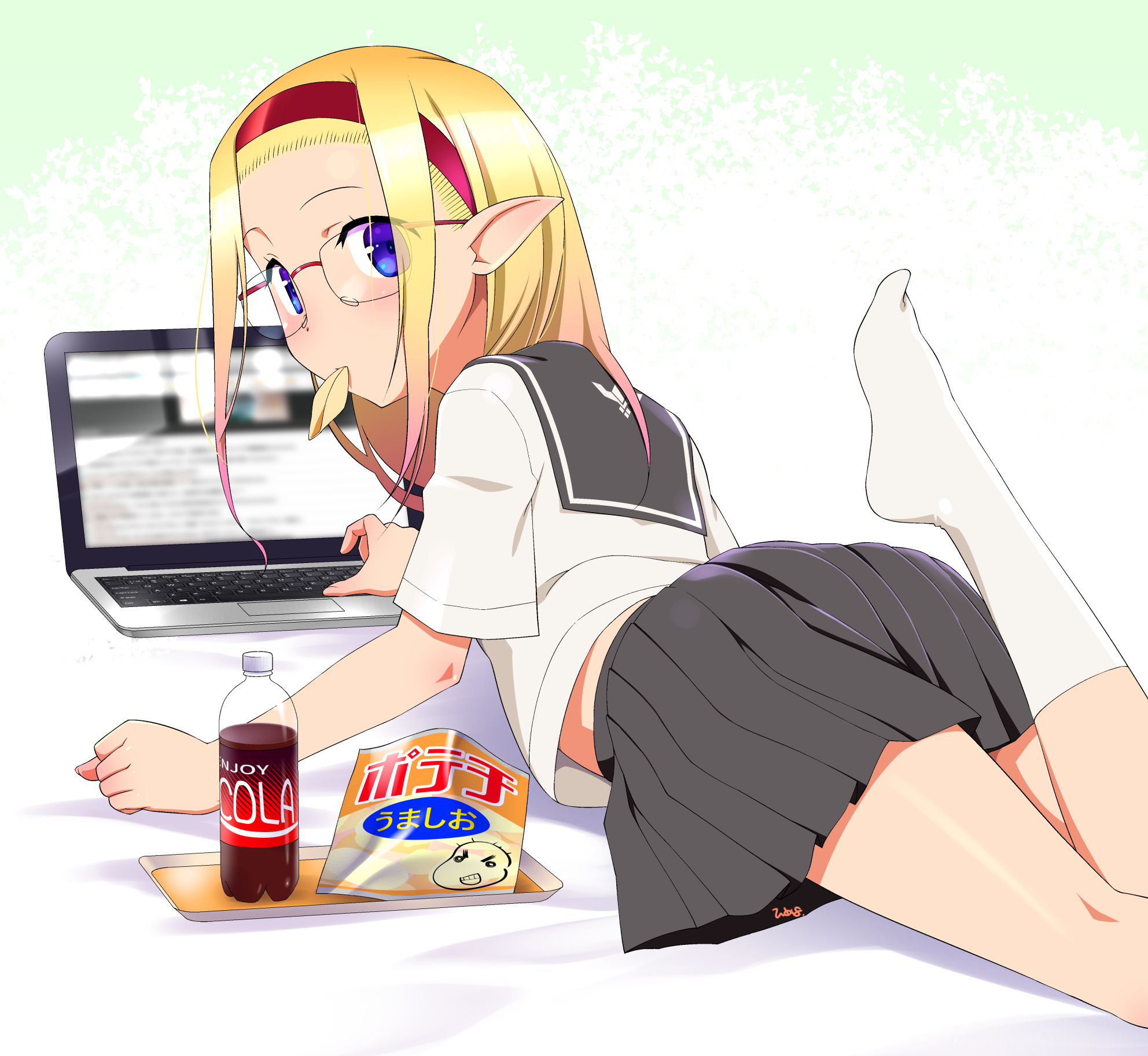 1girl bag_of_chips black_sailor_collar black_skirt blonde_hair blue_eyes bottle chips_(food) computer elf eyes_visible_through_hair food food_in_mouth glasses hairband highres himehachi_(hime8manga) laptop leg_up long_hair looking_back lying miniskirt on_stomach original pleated_skirt pointy_ears potato_chips red_hairband sailor_collar school_uniform serafuku shirt short_sleeves skirt socks soda soda_bottle solo white_shirt white_socks