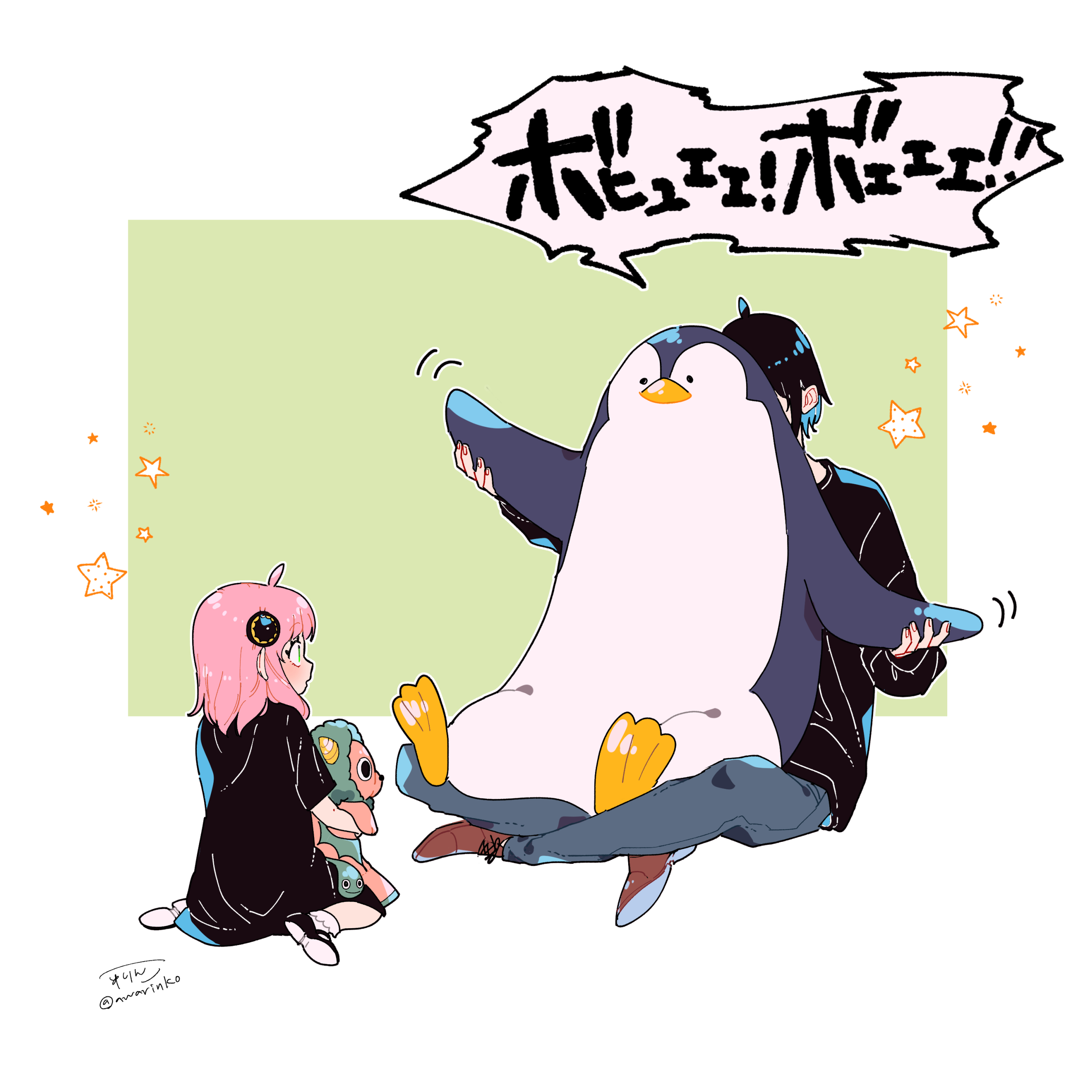 1boy 1girl absurdres anya_(spy_x_family) awarinko black_dress black_hair black_shirt black_shoes blush bobby_socks brown_shoes closed_mouth director_chimera_(spy_x_family) dress green_background green_eyes grey_pants hand_up highres long_sleeves motion_lines pants pink_hair profile puffy_long_sleeves puffy_sleeves shirt shoe_soles shoes short_sleeves sitting socks spy_x_family star_(symbol) stuffed_animal stuffed_penguin stuffed_toy translation_request two-tone_background wariza white_background white_socks yuri_briar
