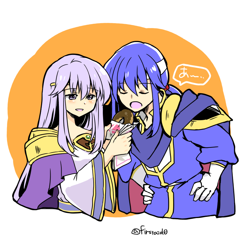 1boy 1girl blue_hair brother_and_sister chocolate_donut circlet closed_eyes donut dress feeding fire_emblem fire_emblem:_genealogy_of_the_holy_war food hands_on_own_hips headband holding holding_food imminent_eating julia_(fire_emblem) long_hair nintendo open_mouth ponytail purple_eyes purple_hair seliph_(fire_emblem) siblings simple_background super_smash_bros._logo white_headband wide_sleeves yukia_(firstaid0)