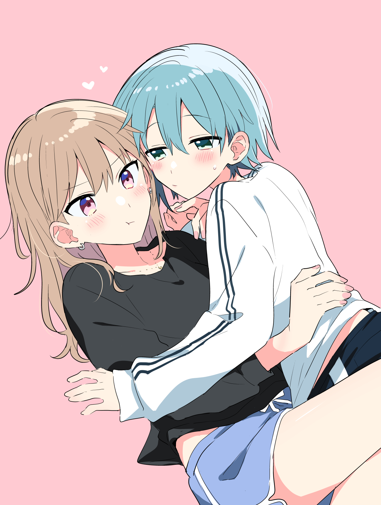 2girls animal_ears black_shirt black_shorts blue_eyes blue_hair blue_shorts blush brown_hair closed_mouth commentary_request dolphin_shorts doushitara_osananajimi_no_kanojo_ni_naremasu_ka!? hand_on_another's_waist heart highres ikoma_minami_(osakano) jewelry long_sleeves makita_yuzu multiple_girls necklace pink_background pink_eyes pout shirt shorts simple_background white_shirt yasaka_syu yuri