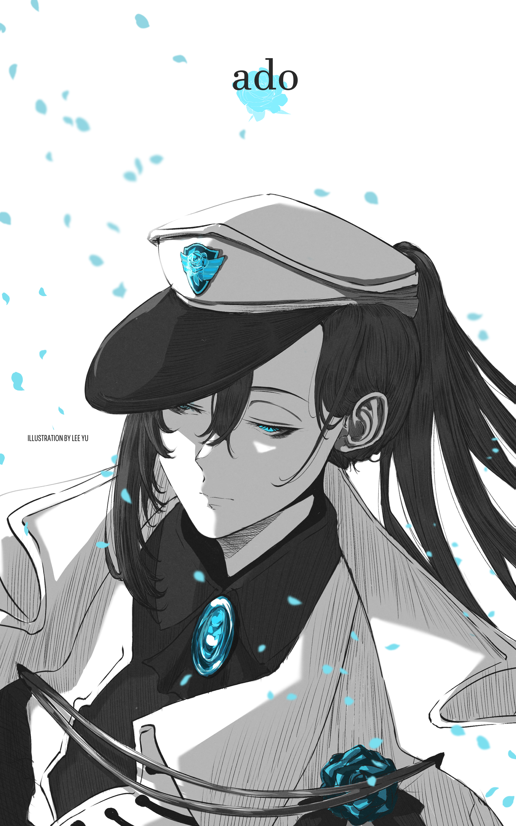 1girl absurdres ado_(utaite) artist_name black_hair blue_eyes blue_flower blue_rose brooch chando_(ado) character_name coat commentary english_commentary falling_petals flower hair_between_eyes hat highres jewelry lee_yu long_hair mixed-language_commentary petals ponytail rose simple_background solo upper_body utaite vest white_background white_coat white_hat white_vest
