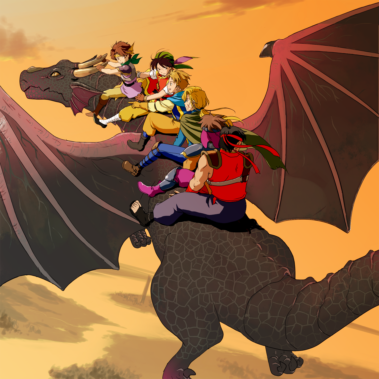 black_(suikoden) black_hair blonde_hair cleo_(suikoden) dragon dragon_horns dragon_wings flying futch_(suikoden) gensou_suikoden gensou_suikoden_i gloves gremio_(suikoden) highres horns muscular muscular_male pahn_(suikoden) sakai_yume short_hair smile ted_(suikoden) tir_mcdohl wings