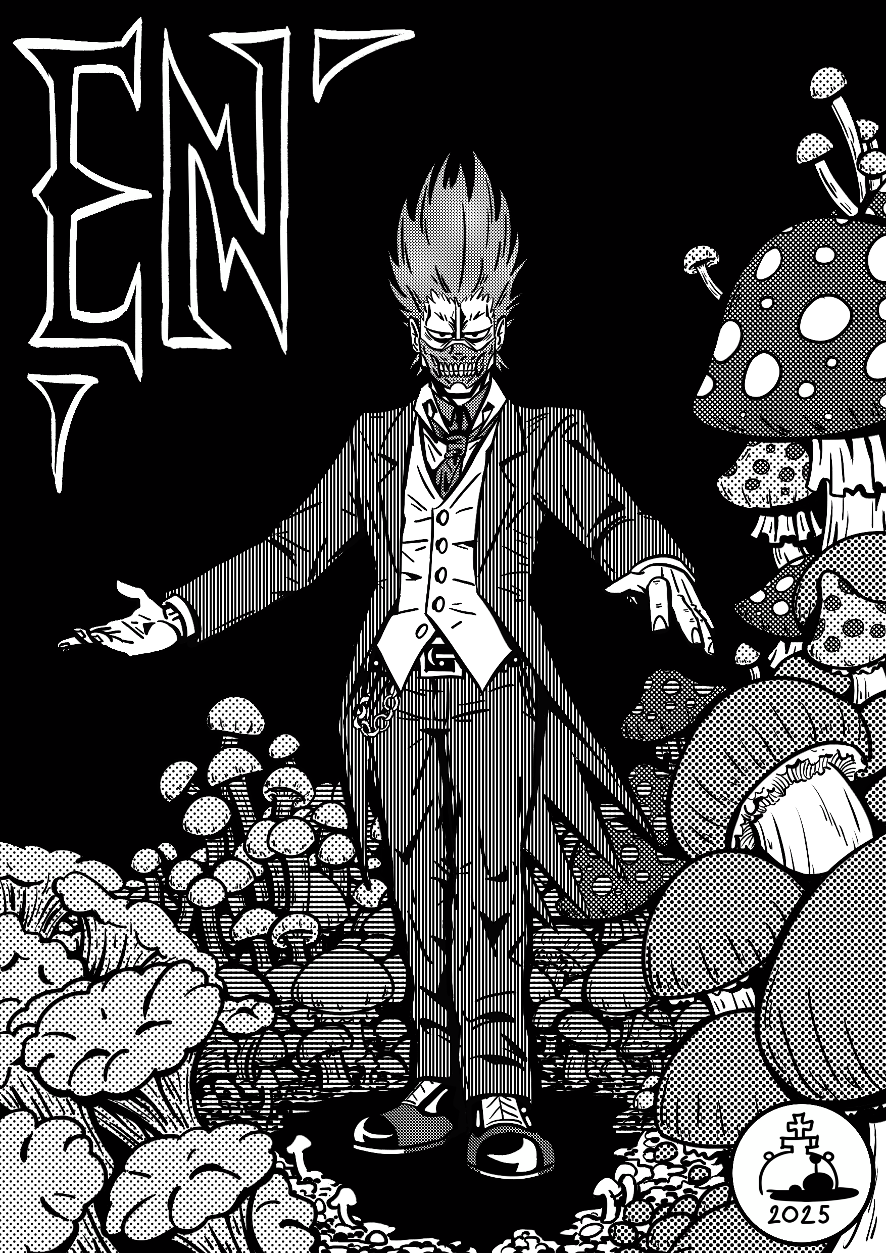 2025 absurdres antykvarnyy_kalamar dorohedoro en_(dorohedoro) evil_eyes formal_clothes highres jacket male_focus mask mouth_mask mushroom necktie open_clothes open_jacket screentones standing