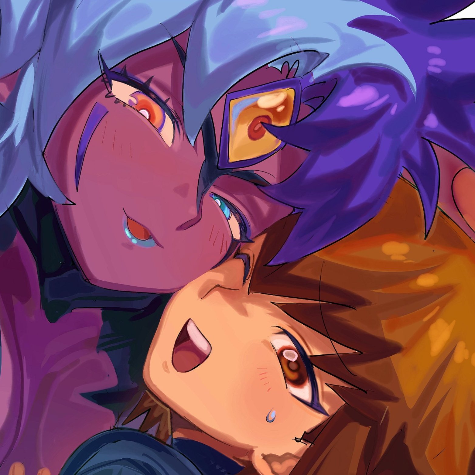 1boy 1other blue_eyes blue_hair blue_lips brown_eyes brown_hair colored_sclera colored_skin heterochromia highres multicolored_hair one_eye_closed orange_eyes orange_sclera purple_hair purple_skin tawashipurin third_eye two-tone_hair yu-gi-oh! yu-gi-oh!_gx yubel yuki_judai