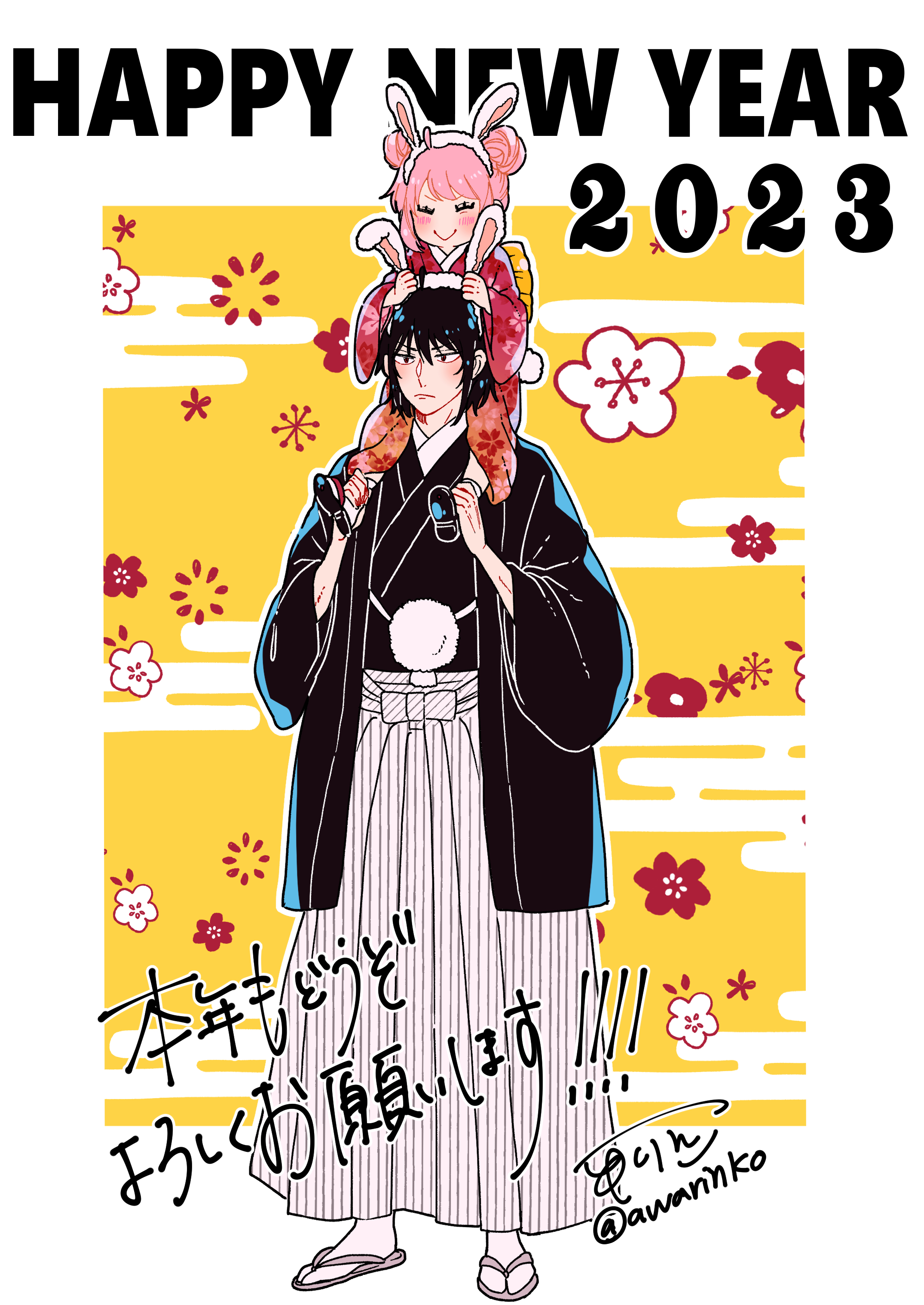 1boy 1girl 2023 absurdres animal_ears anya_(spy_x_family) awarinko black_hair black_shoes blush bob_cut carrying child chinese_zodiac closed_eyes double_bun fake_animal_ears floral_print frown full_body gradient_clothes gradient_kimono grey_sandals hair_between_eyes hair_bun happy_new_year highres japanese_clothes kimono long_sleeves medium_hair new_year piggyback pink_hair print_kimono rabbit_ears sandals shoes short_hair smile socks spy_x_family swept_bangs translation_request twitter_username uncle_and_niece v-shaped_eyebrows white_socks wide_sleeves year_of_the_rabbit yuri_briar zouri