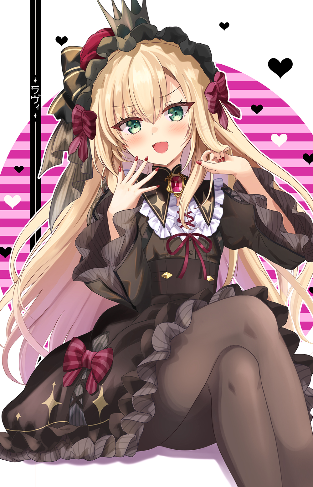 1boy :d black_dress blonde_hair bow brown_pantyhose colored_shadow commentary_request crossdressing crossdressing_(mtf) crown dress feet_out_of_frame frilled_dress frills green_eyes hair_between_eyes hair_bow highres long_hair long_sleeves looking_at_viewer male_focus mini_crown motoi_ayumu nail_polish nijisanji open_mouth pantyhose purple_bow purple_ribbon red_nails ribbon shadow smile solo striped_background striped_bow uzuki_kou uzuki_kou_(4th_costume) very_long_hair virtual_youtuber wide_sleeves