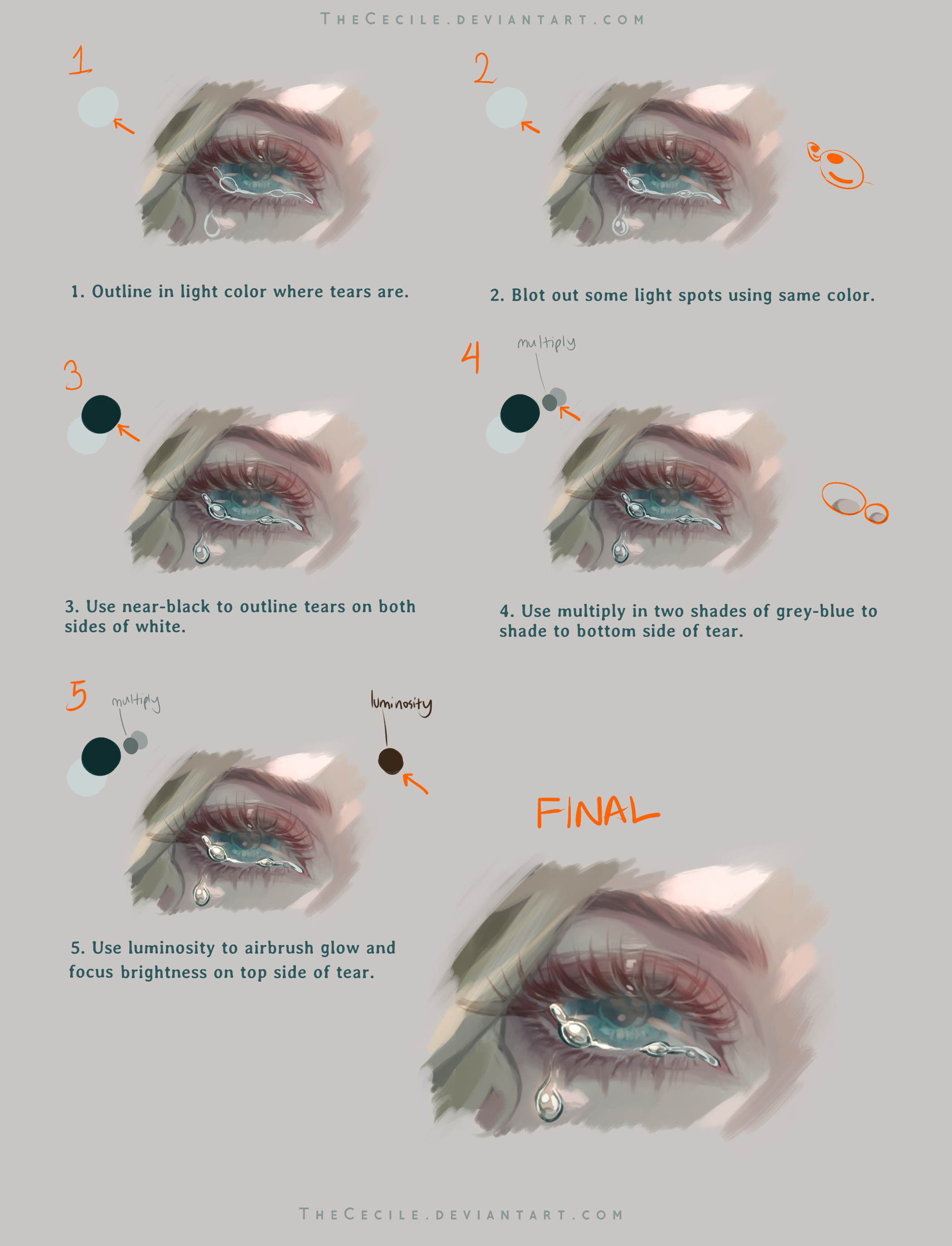 1girl absurdres arrow_(symbol) blonde_hair blue_eyes color_guide commentary crying crying_with_eyes_open deviantart_username english_commentary english_text eye_focus eyelashes grey_background highres how_to numbered original painttool_sai_(medium) sequential simple_background teardrop tears the_cecile thick_eyebrows