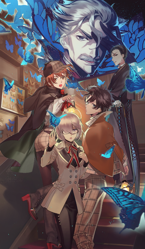 2girls 3boys black-framed_eyewear black_boots black_coat black_hair black_pants black_pantyhose black_vest blue_eyes boots breasts brown_hair brown_hat brown_jacket bug butterfly buttons cane closed_mouth coat collared_shirt contrast_lapels commentary_request cross-laced_clothes crossed_arms double-breasted facial_hair fate/grand_order fate_(series) from_side fujimaru_ritsuka_(female) fujimaru_ritsuka_(female)_(escape_from_baker_street) fujimaru_ritsuka_(male) fujimaru_ritsuka_(male)_(escape_from_baker_street) glasses grey_facial_hair grey_hair hair_over_one_eye hair_slicked_back hat high_heels holding holding_cane holding_lantern holding_smoking_pipe insect jacket james_moriarty_(archer)_(fate) kazuaki lantern lapels leg_up light_particles looking_at_viewer mash_kyrielight mash_kyrielight_(escape_from_baker_street) medium_breasts medium_hair multiple_boys multiple_girls mustache neck_ribbon official_art open_mouth orange_eyes orange_hair pants pantyhose parted_lips pink_hair plaid_clothes plaid_jacket plaid_pants plaid_shorts purple_eyes red_ribbon ribbon sherlock_holmes_(fate) shirt short_hair shorts smoking_pipe stairs standing teeth third-party_source two-sided_coat two-sided_fabric v-shaped_eyebrows vest waistcoat white_jacket white_shirt