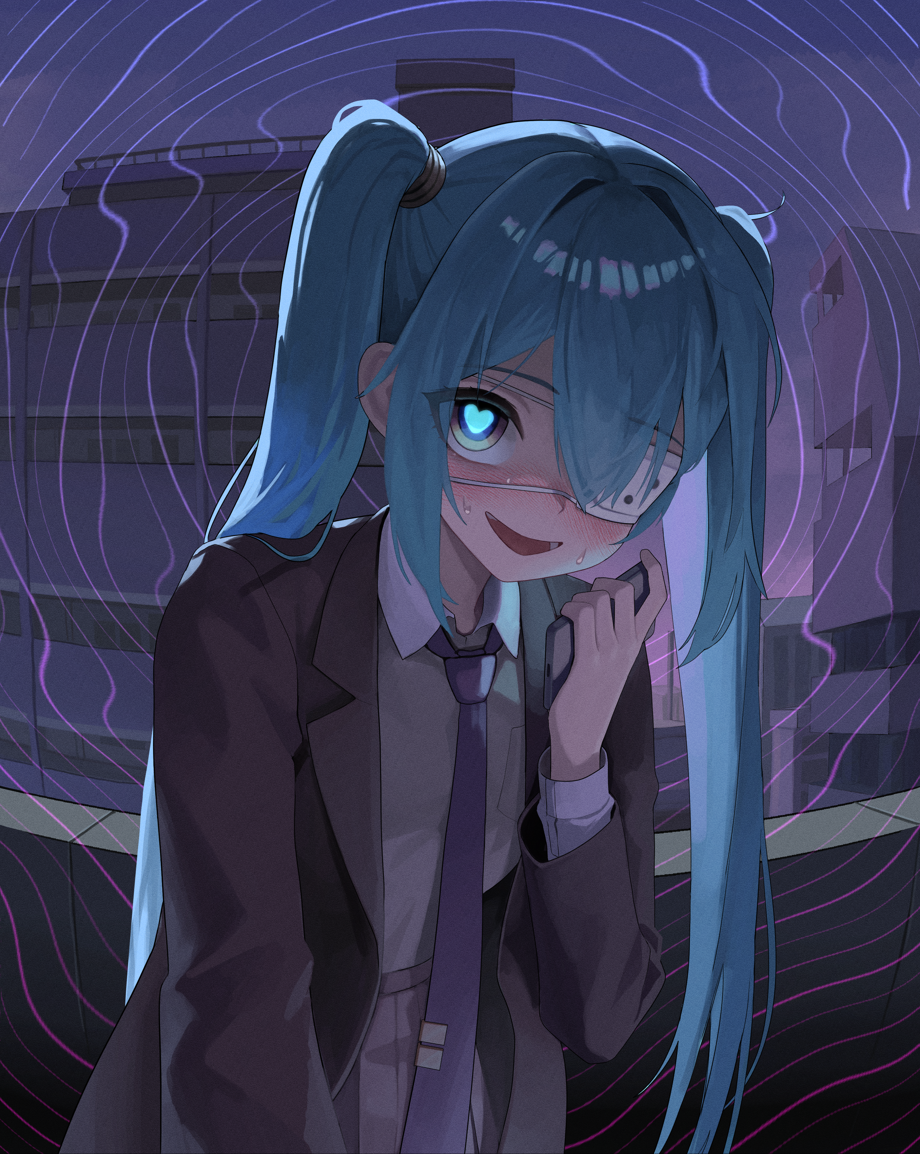 1girl absurdres black_jacket black_skirt blue_eyes blue_hair blue_necktie blush brown_vest collared_shirt dolgom eyepatch hair_between_eyes hair_intakes hatsune_miku heart heart-shaped_pupils highres holding holding_phone jacket long_hair long_sleeves looking_at_viewer lower_teeth_only medical_eyepatch monitoring_(vocaloid) necktie open_clothes open_jacket open_mouth outdoors phone pleated_skirt shirt skirt solo sweat symbol-shaped_pupils teeth tie_clip twintails very_long_hair vest vocaloid white_shirt