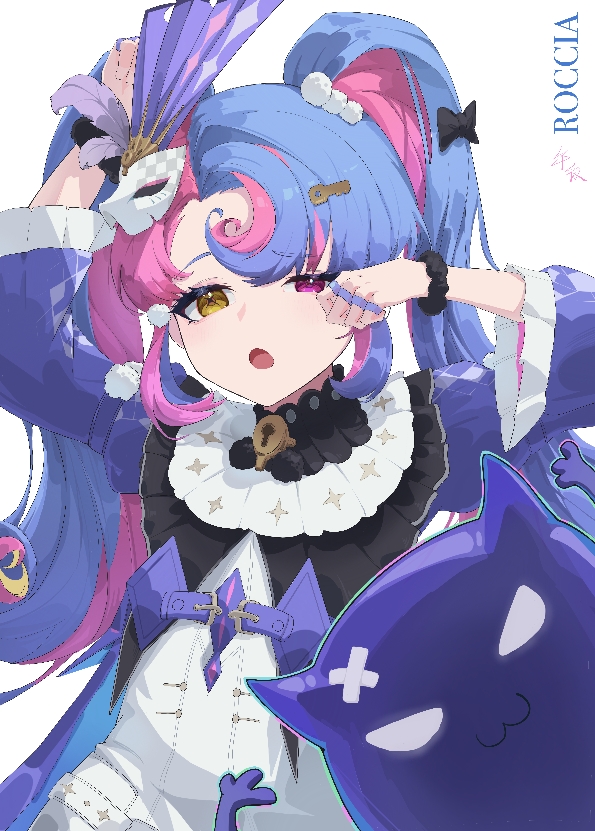 1girl :o black_collar blue_hair character_name chinese_commentary coat collar commentary_request dress eye_mask hand_up heterochromia jewelry key_hair_ornament long_hair long_sleeves looking_at_viewer mask mask_on_head multicolored_hair multiple_rings open_mouth pero_(wuthering_waves) pink_eyes pink_hair purple_coat ring roccia_(wuthering_waves) rubbing_eyes simple_background twintails two-tone_hair upper_body white_background white_dress wuthering_waves wuye_z yawning yellow_eyes