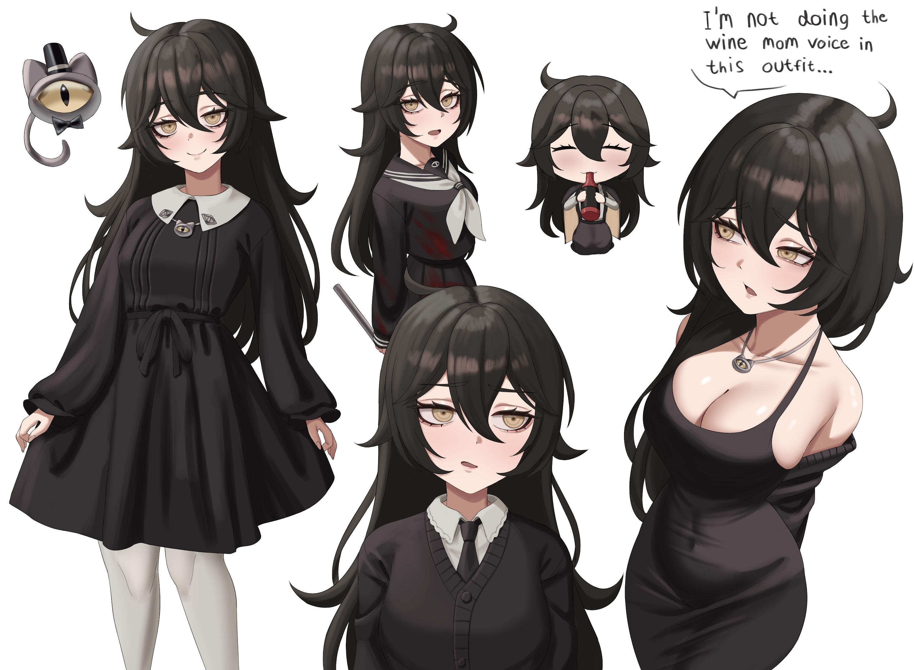 1girl :/ ahoge alternate_breast_size alternate_costume bad_link bare_shoulders black_dress black_necktie black_serafuku black_shirt black_skirt blood blood_stain breasts cape chibi cleavage collage crowbar dress english_text grimmi_(vtuber) hat highres holding holding_crowbar horror_(theme) hot_sauce indie_virtual_youtuber jacket jacket_on_shoulders large_breasts light_blush long_hair messy_hair necktie oeffe_(oeffe_blank) pale_skin school_uniform serafuku shirt sidelocks skelter_(grimmivt) skirt smile socks solo speech_bubble thighhighs top_hat very_long_hair virtual_youtuber white_socks yellow_eyes