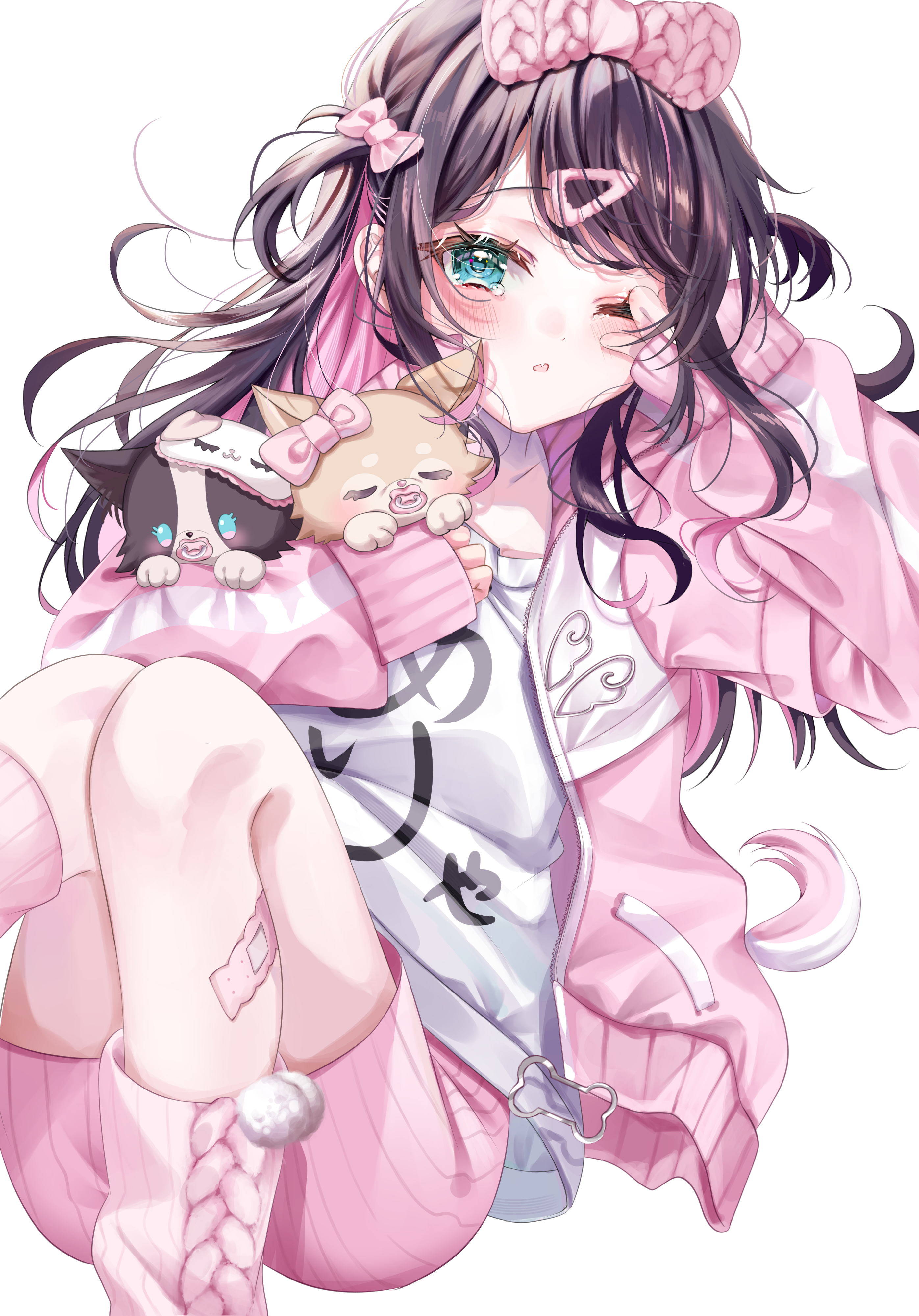1girl absurdres aqua_eyes black_hair bow colored_inner_hair hair_bow hair_ornament hairclip highres jacket kaga_nazuna koya_toofu leg_warmers long_hair long_sleeves looking_at_viewer multicolored_hair one_eye_closed open_clothes open_jacket parted_lips pink_bow pink_hair pink_jacket pink_leg_warmers pink_shorts shirt shorts simple_background sleepy solo tearing_up virtual_youtuber vspo! white_background white_shirt