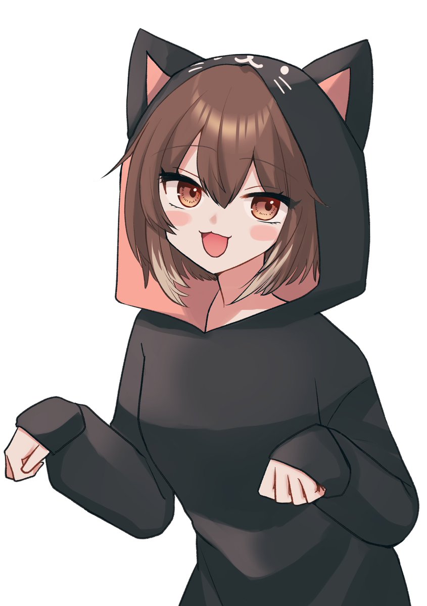 1girl 87mitsu4 :3 animal_hood blush brown_eyes brown_hair cat_hood clenched_hands colored_tips commentary cyon_hart english_commentary hair_between_eyes hood hood_up multicolored_hair open_mouth second-party_source simple_background sleeves_past_wrists solo tongue v&u_entertainment virtual_youtuber white_background