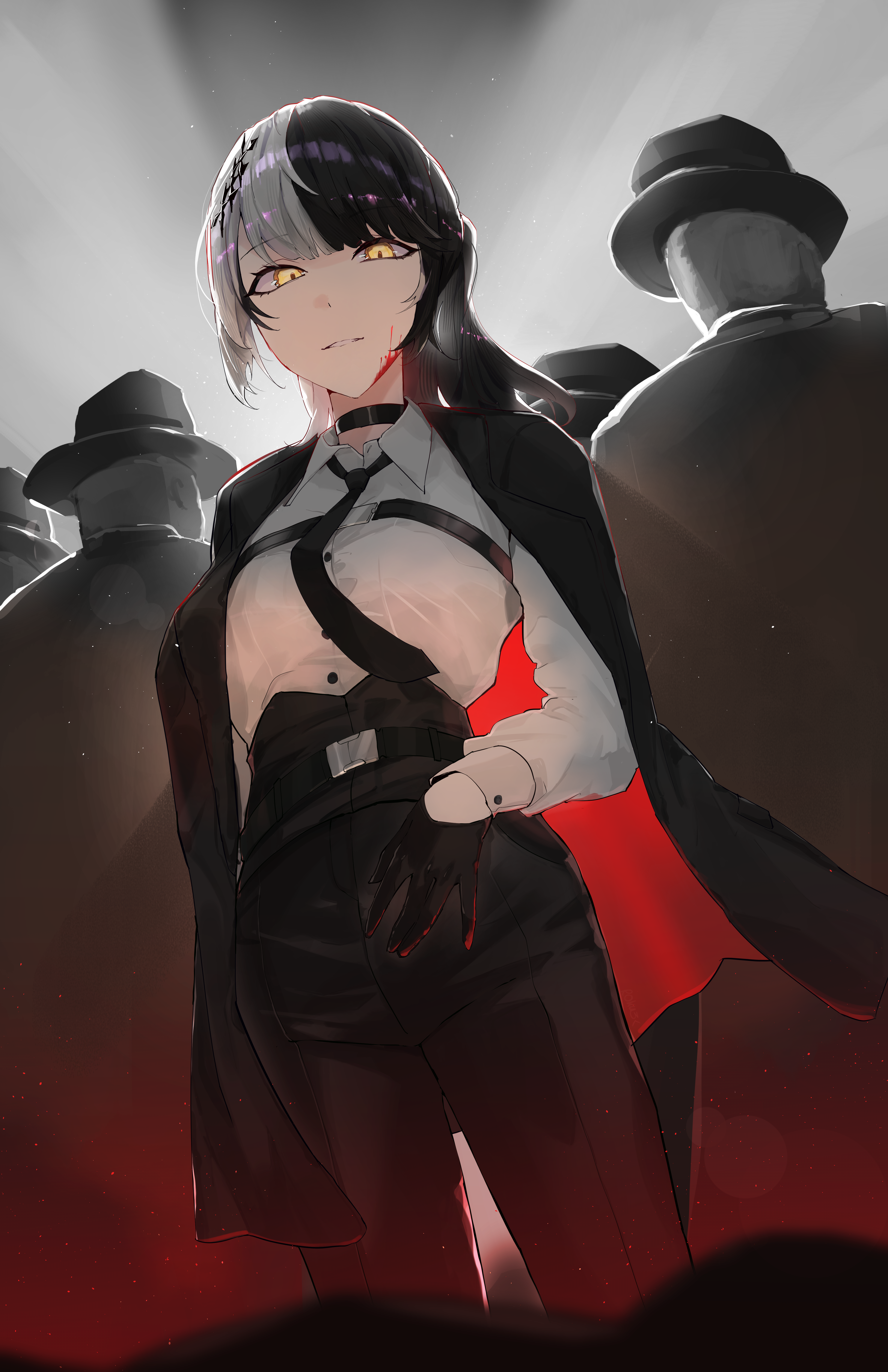 1girl 4boys absurdres alternate_costume black_coat black_gloves black_hair black_necktie black_pants blood blood_on_face coat collared_shirt fedora formal_clothes gloves grey_coat grey_hair hat highres hololive hololive_english kurochanai looking_at_viewer multicolored_hair multiple_boys necktie pant_suit pants parted_lips shiori_novella shirt solo_focus split-color_hair suit virtual_youtuber white_shirt yellow_eyes