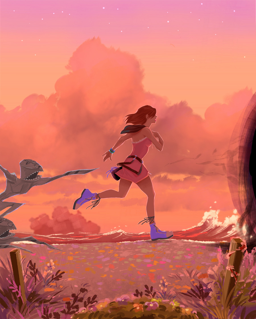 1girl beach cloud commentary creature dress english_commentary floating_hair hood hood_down kairi_(kingdom_hearts) kingdom_hearts kingdom_hearts_ii long_hair mimamilux nobody_(kingdom_hearts) ocean orange_sky outdoors pink_dress purple_shoes red_hair running sand shoes sky water