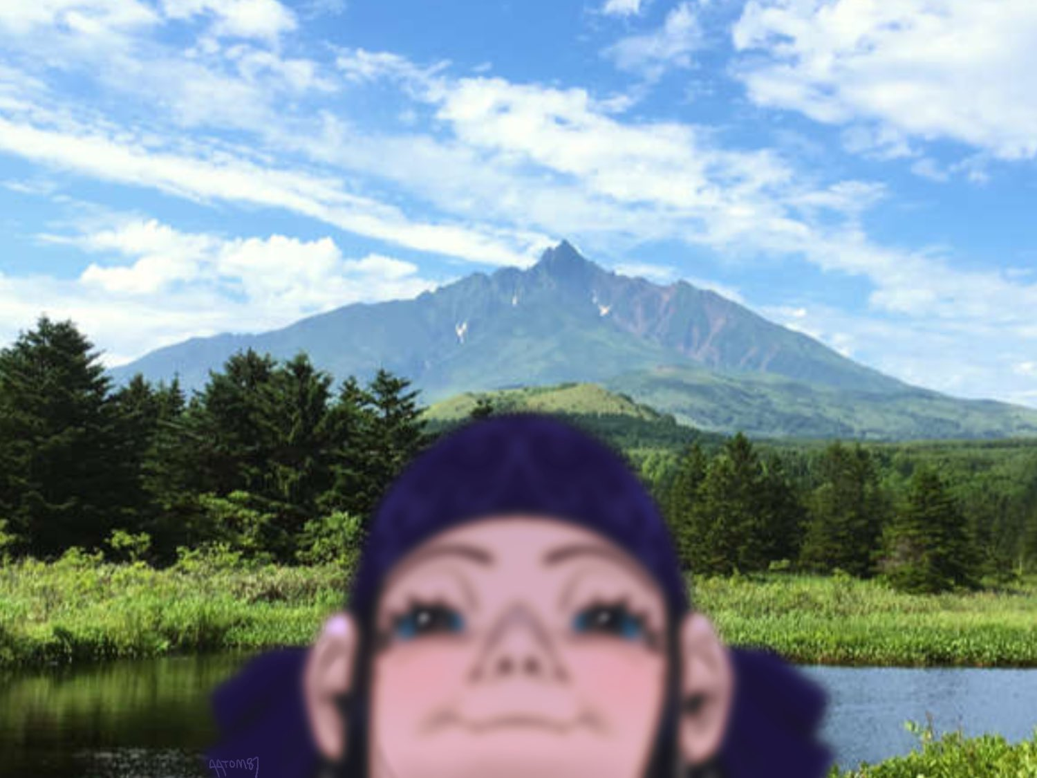 1girl aatom87 asirpa black_hair blue_eyes blue_sky blurry blurry_foreground cloud commentary forest frown golden_kamuy headband lake mountain nature photo_background sky smile smirk smug solo untranslatable_commentary