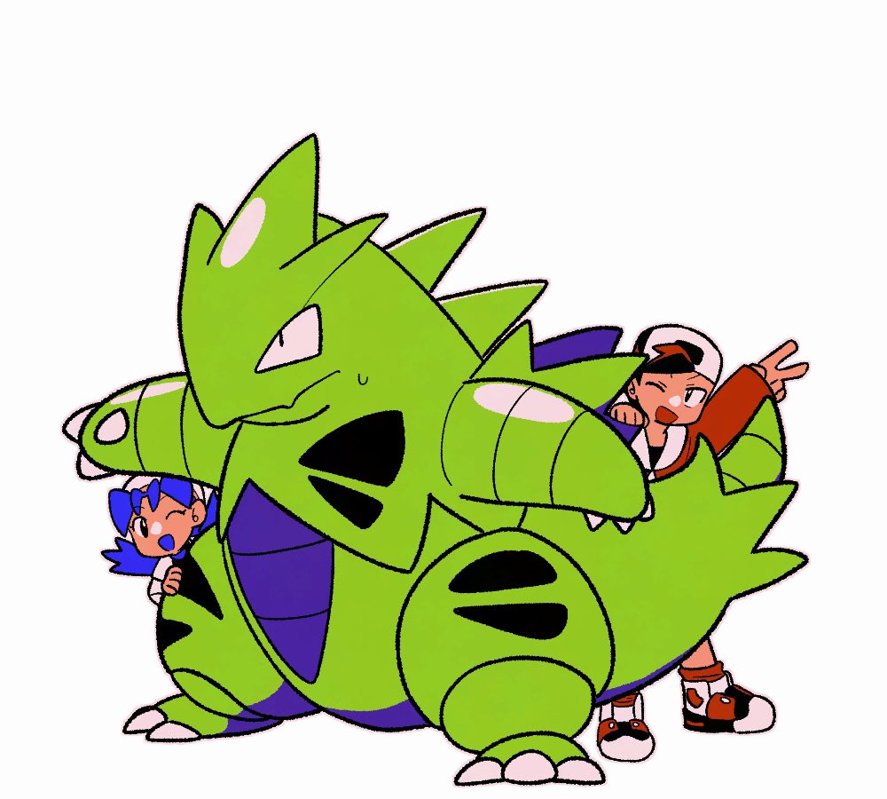 1boy 1girl ;d arm_up blue_hair ethan_(pokemon) gen_2_pokemon hat jacket kris_(pokemon) nintendo one_eye_closed open_mouth peeking_out pokemon pokemon_(creature) pokemon_gold/silver/crystal red_jacket red_socks shoes simple_background smile socks standing twintails tyako_089 tyranitar v white_background white_hat white_jacket